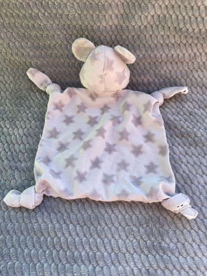 Doudou plat koala gris et blanc devant à pois et au dos à motifs des étoiles 4 noeuds aux extrémités Vertbaudet Occasion en très bon état ( étiquette coupée ) Vous achetez le doudou que vous voyez sur la photo