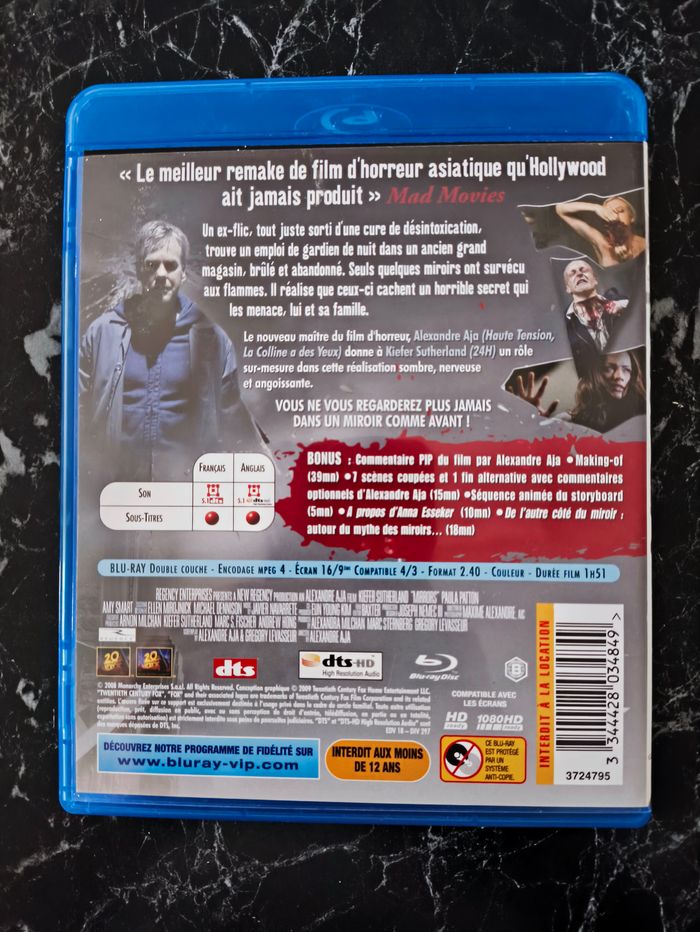 Film Mirrors (2008) en très bon état. Horreur et Thriller d’Alexandre Aja avec Kiefer Sutherland, Paula Patton, Cameron Boyce, Amy Smart et Jason Flemyng. Plusieurs autres films (DVD et blu-ray) et séries télé disponibles sur mon dressing. Si vous avez des questions ou souhaitez plus de photos, n'hésitez pas à me demander. Prix négociable seulement si vous achetez plusieurs articles. N'hésitez pas à créer un lot et à faire une proposition raisonnable et à me demander un prix. Tag de recherche : #neboo_video #neboo_bluray #neboo_film blu ray bluray langue français française French FR