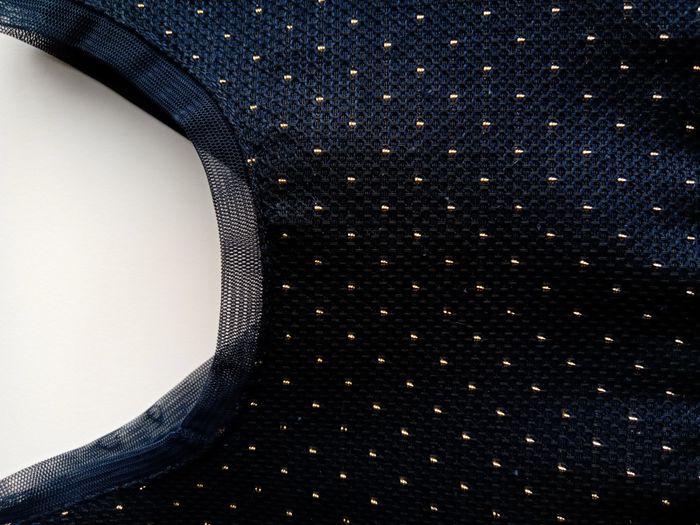 Magnifique robe neuve bleu marine et pois dorés, tissu de qualité, doublée, raffinée, un joli noeud au dos, se ferme avec de jolis boutons dorés.