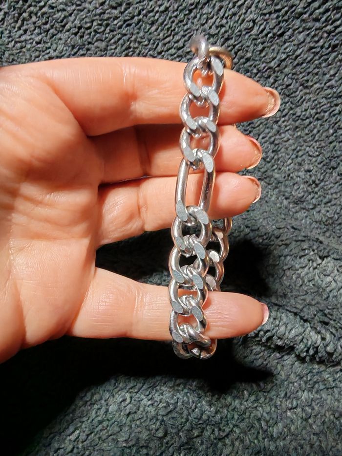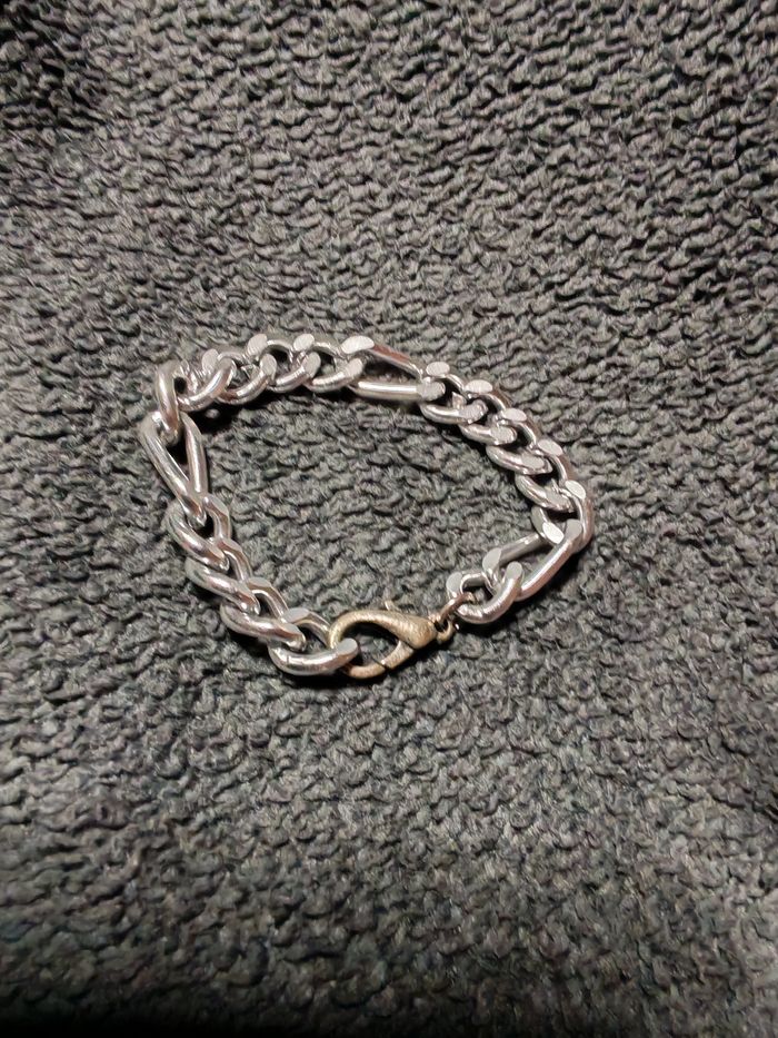 Bracelet argenté à gros maillons, tendance, type maille Figaro 5 en 1, en très bon état général, un peu noirci au niveau du fermoière (à l'ntérieur). Dmensions : Longueur : 17 cm Largeur : 1 cm Poids : 12g