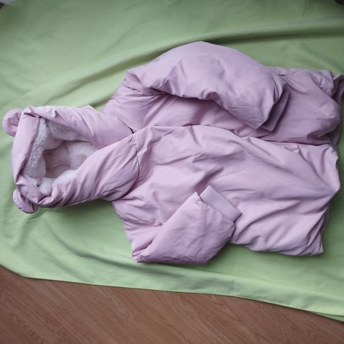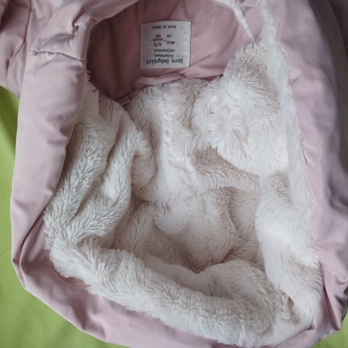 Manteau doudoune à capuche , en duvet et plume, et intérieur et capuche tout doux comme une peluche ! De chez Zara baby girl. 2 poches sur les côtés du manteau, double fermeture , une par boutons pression et une autre par fermeture métallique. Couleur rose tendre.