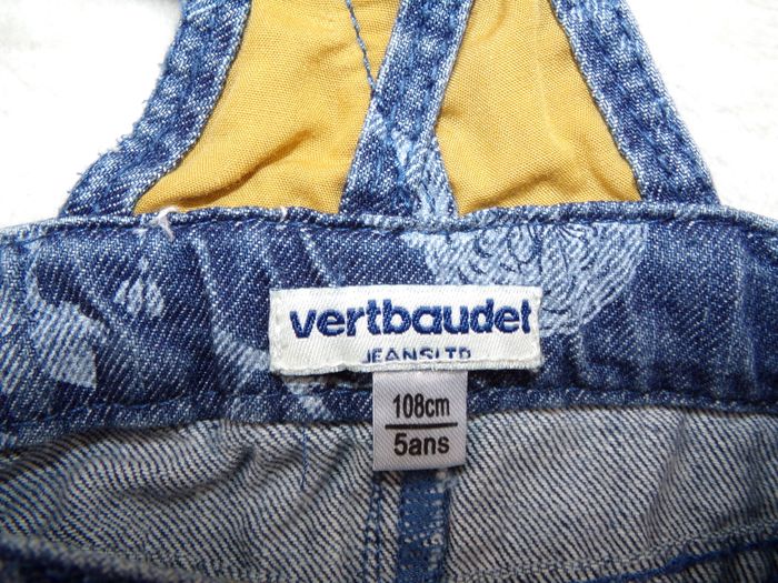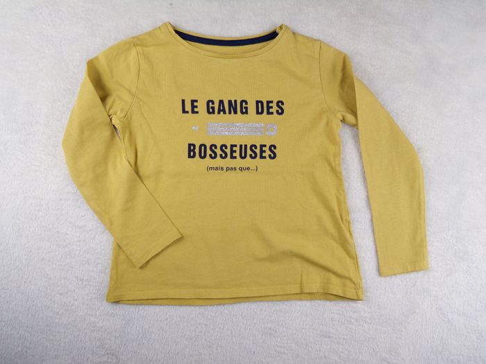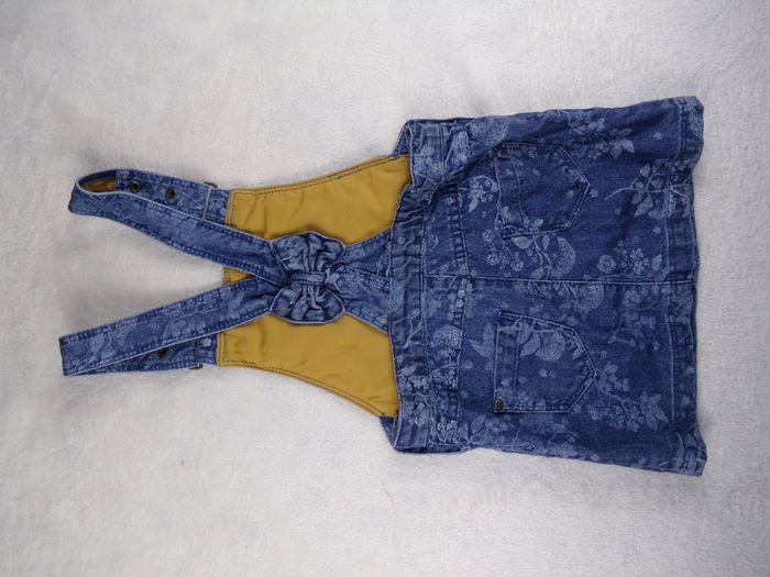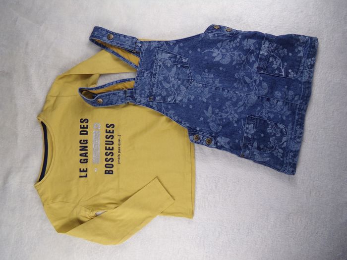 Ensemble composé de 2 articles: - 1 T-shirt à manches longues jaune avec un imprimé "le gang des bosseuses" devant - 1 robe salopette en jean bleu avec un motif blanc, taille élastique réglable et bouton pression, bretelles réglables sur deux positions avec des pressions Taille 5 ans - 108 et 110 cm - ni trous, ni tâches #darkatalia5ans B6