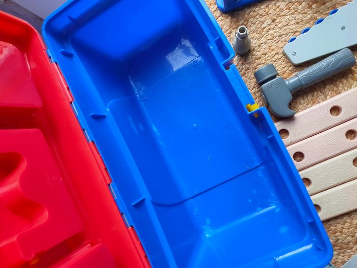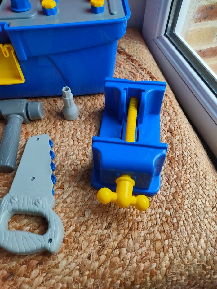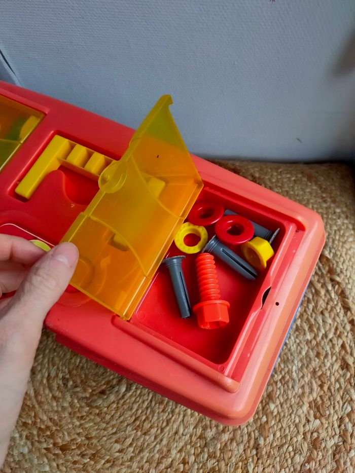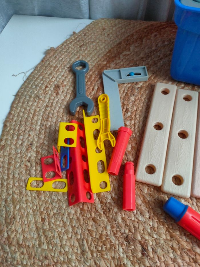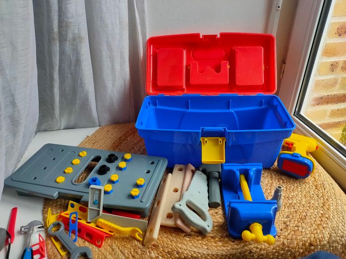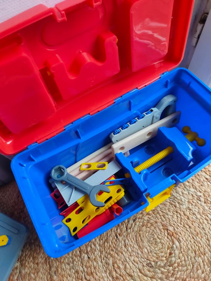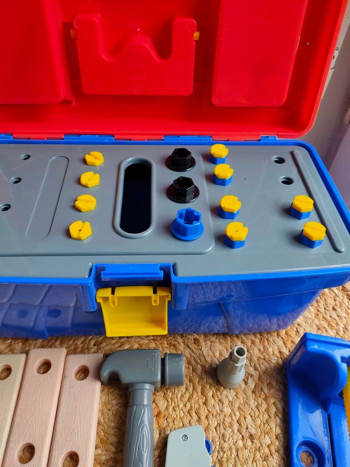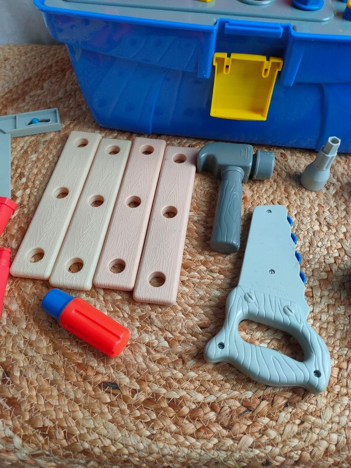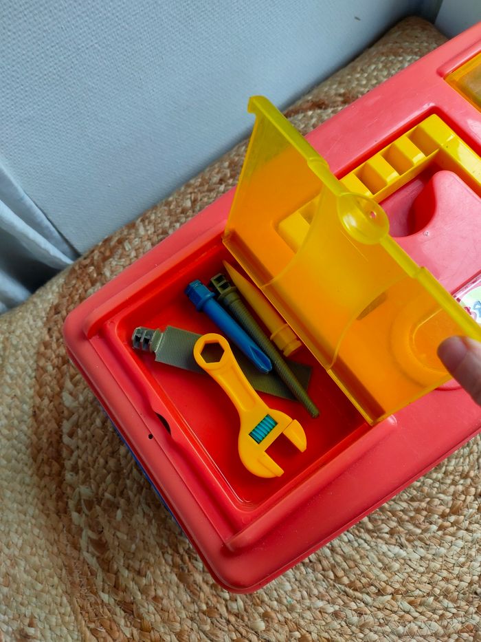 Malette a outils pour enfants, avec plein d'accessoires, d'outils en plastique pour faire comme les grands. L'ensemble a été manipulé, le fond de la caisse a des traces, l'ensemble est en bon état. Prix ferme, PAS DE NÉGO!!!