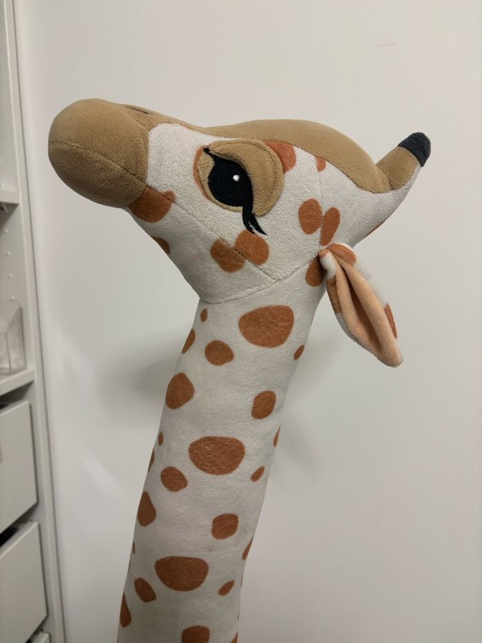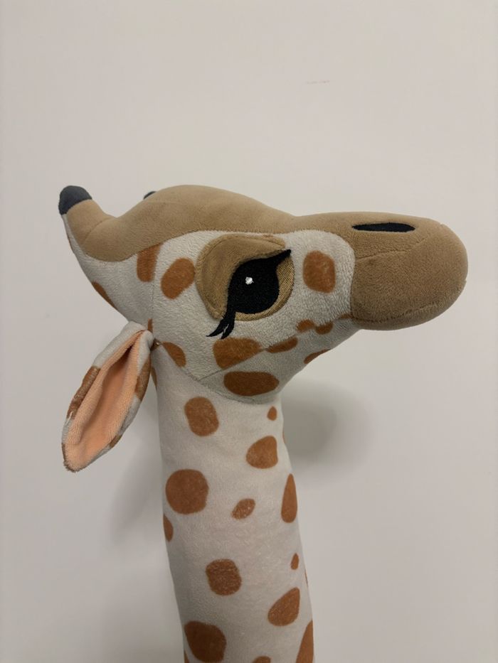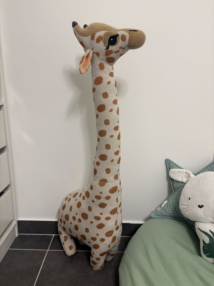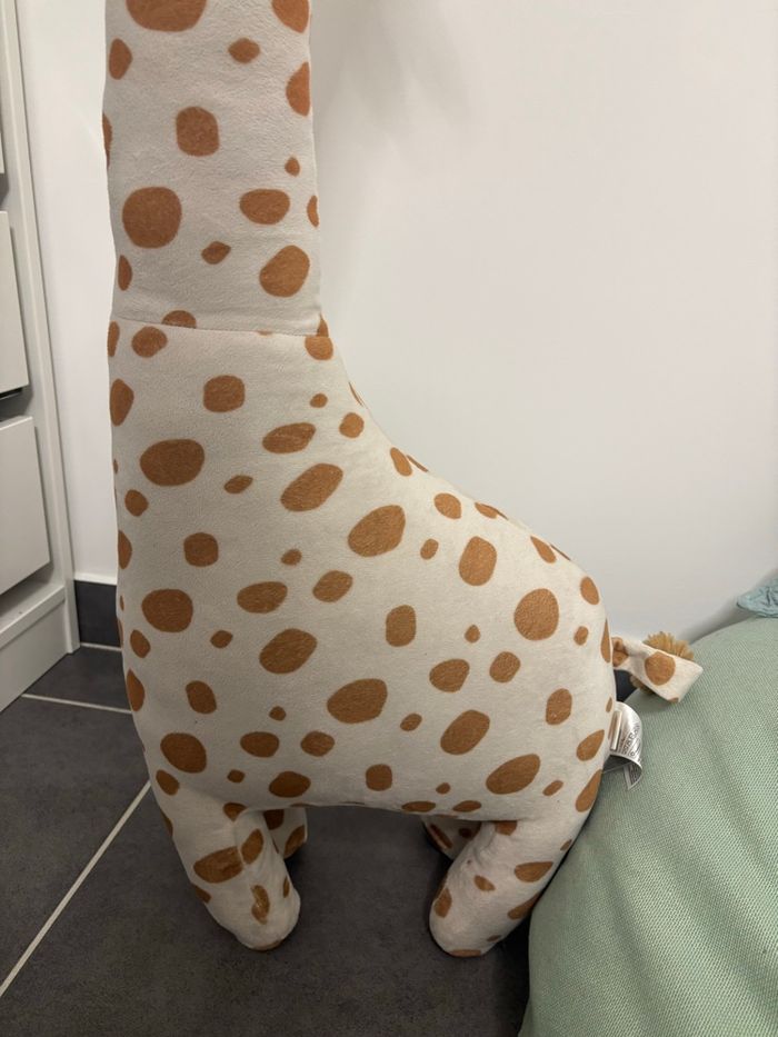 Grande girafe en tissu peluche doux avec applications et détails brodés. Modèle avec pattes généreusement rembourrées pour plus de stabilité. Hauteur 100 cm environ. Largeur au point le plus large 35 cm environ. En parfait état