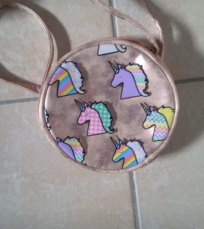 🦍 bonjour 🦍 Sac à main rond avec licorne dessus effet rose dégradé diamètre environ 15 cm sur 4 cm. Mon acquisition est définitive #sacàmain #sacàmainfillette #licorne
