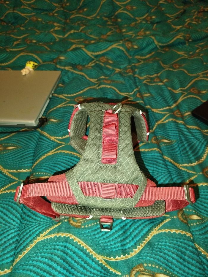 Harnais taille S. Marque: kurgo Couleur style rouge bordeaux (la couleur ne ce vois pas sur les photos) Acheter en novembre mais ne va pas a ma chienne. En super état