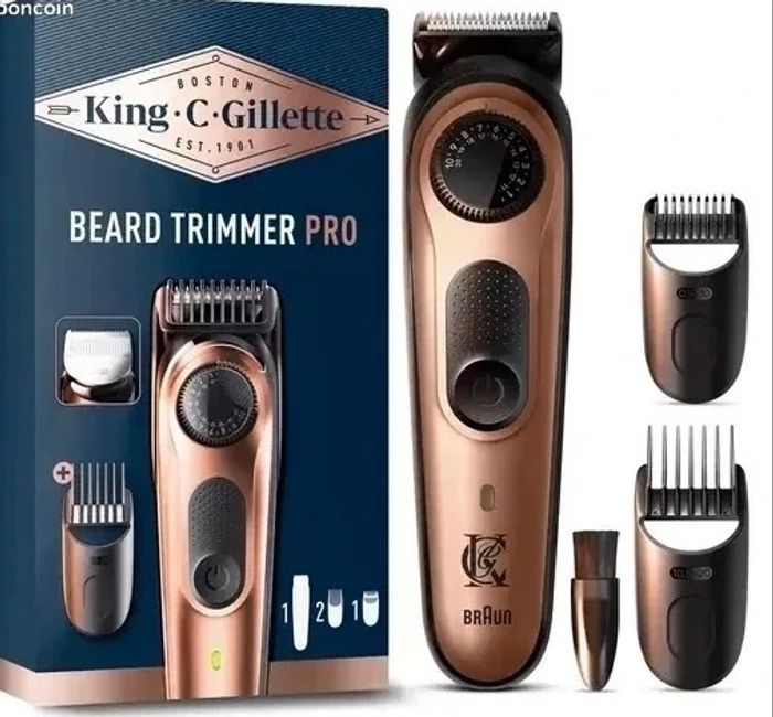 Coffret tondeuse Barbe Beard Trimmer Pro GILLETTE Neuf dans emballage neuf dans emballage La tondeuse à barbe King C. Gillette PRO comprend une molette de précision avec 40 réglages de longueurs et 2 sabots, pour une polyvalence complète afin que vous puissiez tailler votre barbe exactement comme vous le voulez. Le tranchant de la lame dure toute la vie. Vous pouvez utiliser la tondeuse à barbe pendant 80 minutes avec 1 charge, sans perte de puissance. Lorsque vous avez fini, vous pouvez simplement la nettoyer à l'eau courante. Que vos poils de barbe soient longs ou courts, utilisez la tondeuse à barbe King C. Gillette PRO pour prendre soin au mieux de votre barbe.