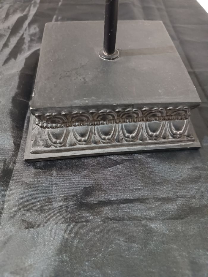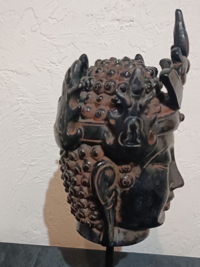 Tête de Bouddha en résine effet bois vissée sur un support 14 cm x 14 cm , hauteur totale env. 40 cm en bon état cf photos