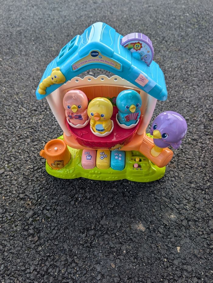 Bonjour, vends La chorale enchantée des Piou-Piou - 12 - 36 moisTrois petits oiseaux musiciens et chanteurs accompagnés de leur maman pour faire chanter et danser Bébé. Ensemble, ils chantent à l’unisson et s’accompagnent à la guitare, à l’accordéon et au tambour.Chaque oisillon est coloré et a son propre instrument. Lorsqu’on insère un oisillon sur la branche d’arbre, il est reconnu et joue un morceau avec son instrument. On apprend également sa couleur.Lorsqu’on place un oisillon dans sa coquille, il se met à chanter. Si on ajoute les autres oisillons au fur et à mesure, ils s’ajoutent à la chanson initiale et chantent en harmonie.Les trois notes du piano interactives et colorées permettent de découvrir de jolies phrases et des sons amusants.Dans leur nid, les oisillons sautillent et font des pirouettes lorsqu’on joue du piano ou bouge la branche sur laquelle est posée leur maman.Deux modes de jeu : un mode Découvertes pour apprendre les couleurs, les chiffres et des anecdotes sur la chorale et un mode Musique pour entendre de jolies mélodies, découvrir les notes de musiques et faire chanter les Piou Piou.2 chansons et 15 mélodies.Boîte try-me. Fonctionne avec 2 piles LR6