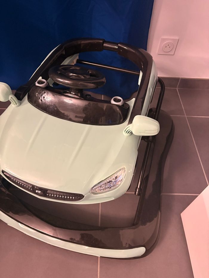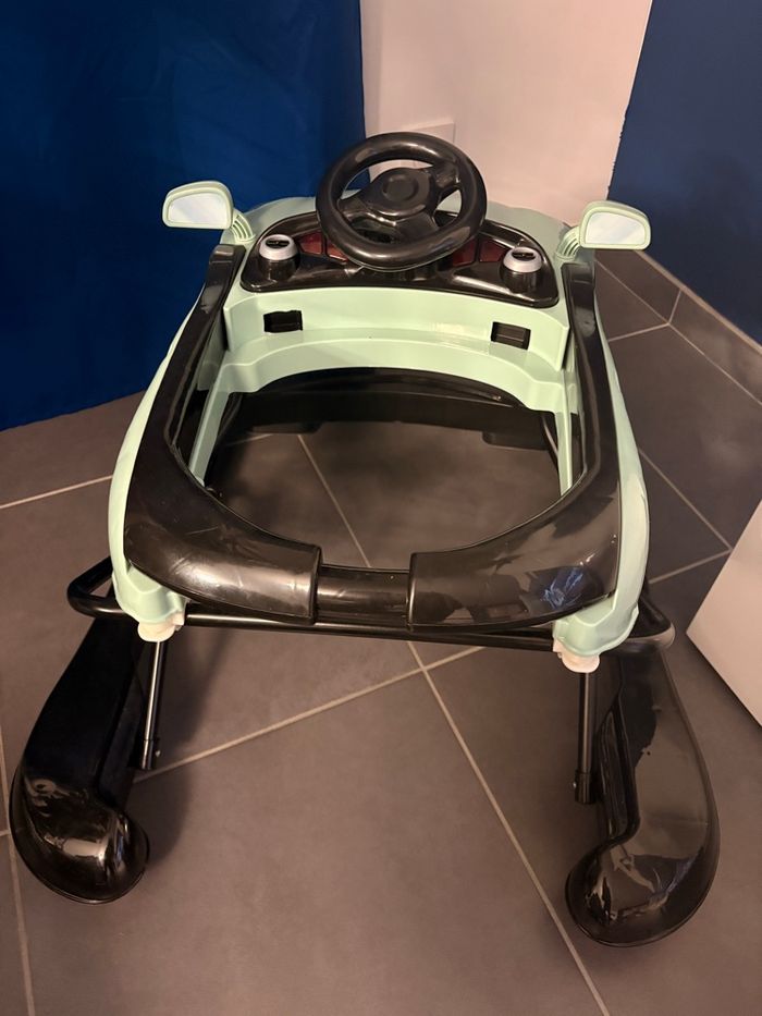Réglable à 3 hauteurs différentes Tableau de bord avec éclairage Différentes mélodies Système de pliage facile à ranger 4 roues, dont 2 roues avant pivotantes à 360 Peut être converti en poussette Housse amovible et lavable Poids max. de l’enfant : 12 kg 2 piles AA Poids du jouet : 5 kg Dimensions du jouet : 63 × 73 × 53 cm Peu utilisé comme neuf . Acheté 93€ en neuf chez Bebe9 Plus de photo en MP