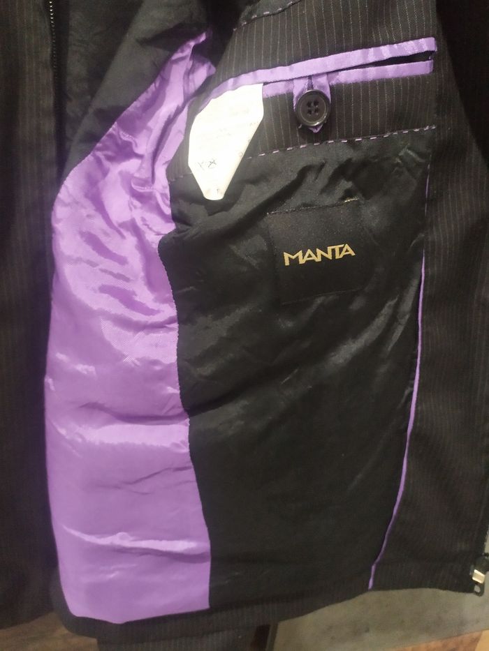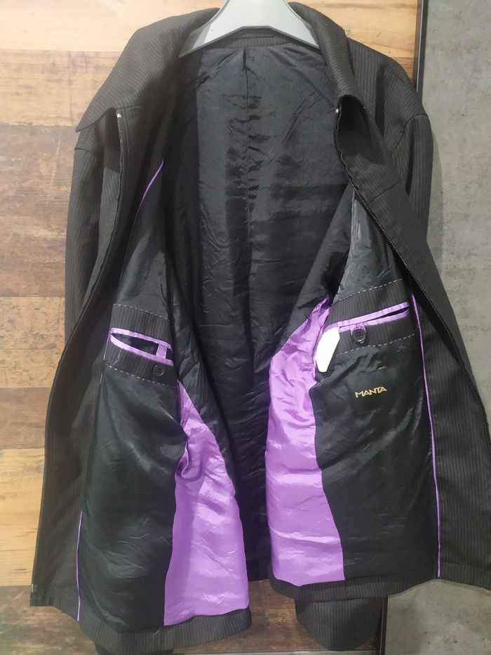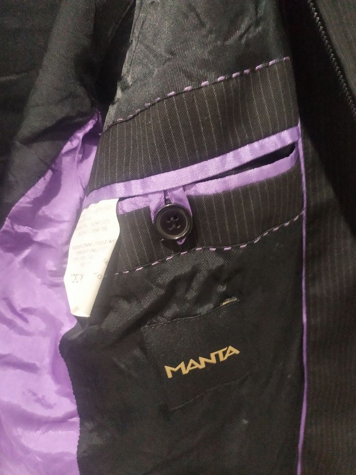 Vends veste de costume, légère, pour homme, taille 50. Correspond à une taille M. Deux poches intérieures avec fermeture éclair. Portée une ou deux fois. Couleur noire avec petites rayures blanches et poches intérieures de couleur violettes. En très bon état, de chez Manta. N'hésitez pas à regarder notre dressing pour regrouper vos achats et réduire les frais de port. Nombreuses tailles encore disponibles en 4,5,6,8 et 10 ans pour fille. Mais également pour garçon en taille 4,5,6,8, 10 et 12 ans. Nombreux jeux, jeux vintage et livres pour enfants également disponibles !