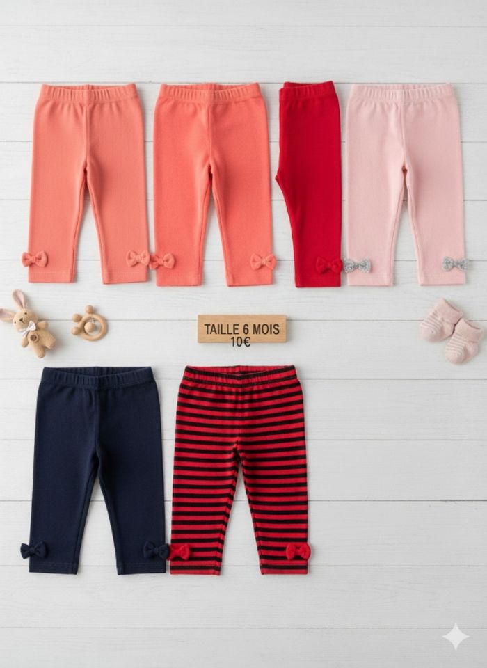 À vendre, un joli ensemble de leggings pour bébé fille en taille 6 mois. Parfaits pour le quotidien, ils sont souples, confortables et faciles à assortir. ​Le lot comprend plusieurs styles et coloris : ​Les "Girly" : Un rose pâle avec petits nœuds argentés aux chevilles, un fuchsia avec volants et broderie papillon, et un rose vif classique. ​Les Intemporels : Deux leggings bleu marine avec un joli détail de nœud sur le bas de la jambe. ​Les Originaux : Un rouge uni et un rayé noir et rouge pour un look plus peps ! ​Détails : ​Taille : 6 mois (67/68 cm) ​État : Très bon état général (bien entretenus, pas de trous). ​Matière : Coton extensible, très doux pour la peau de bébé.