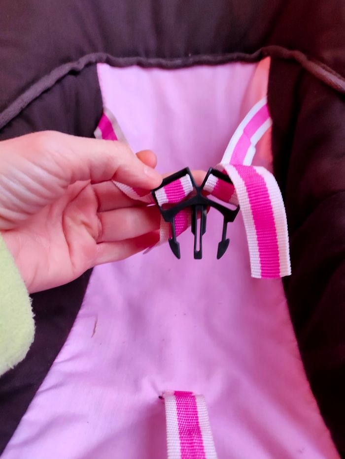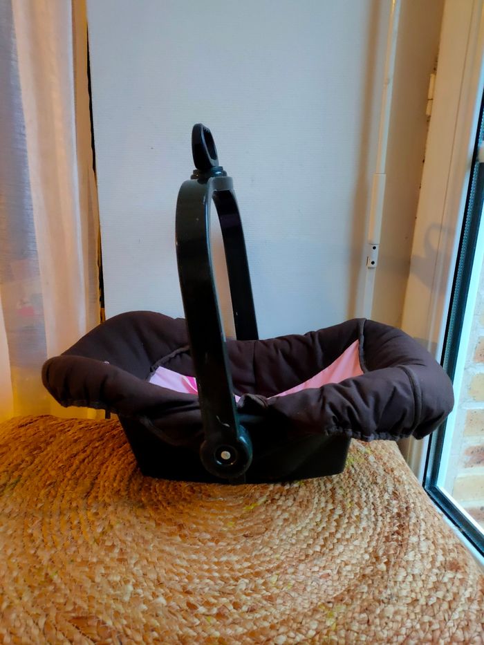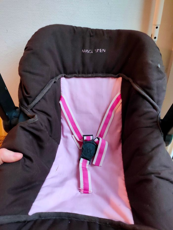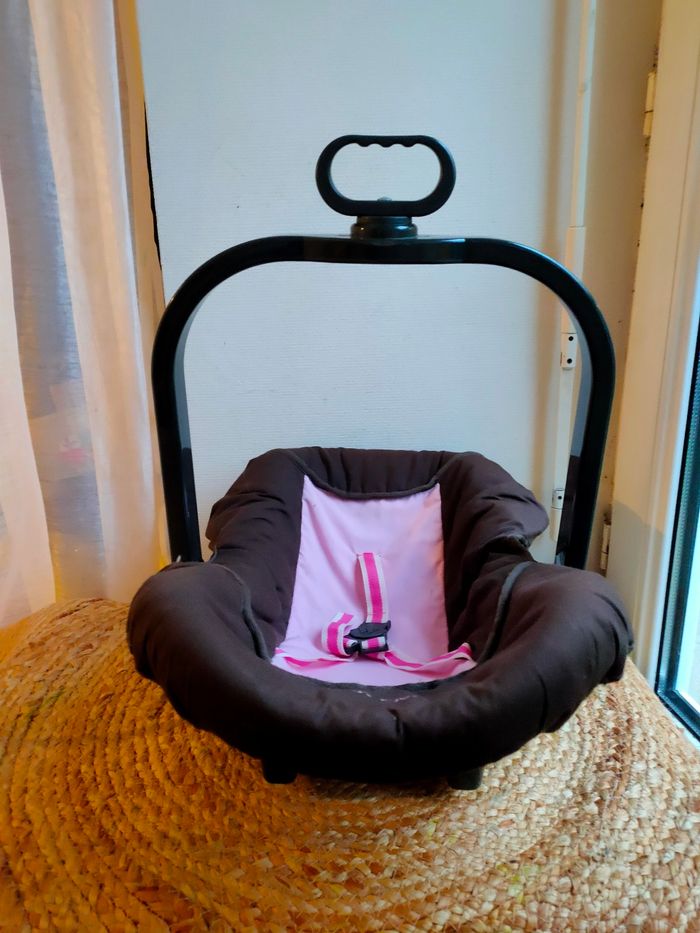 Cosy pour poupée coloris rose et marron, marque Maclaren. L'habillage passe en machine. La marque est partiellement effacé, hormis ce défaut il est en très bon état. Prix ferme, PAS DE NÉGO !!!