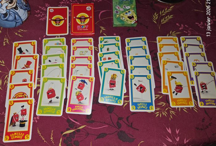 "À vendre : Collection de jeux de cartes variés ! 🃏 * **Jeu de cartes classique Bob l'éponge (BN, 2006)** : L'emballage est globalement en excellent état, à l'exception d'un léger pli discret résultant de l'ouverture initiale du jeu. ✨ * **Jeu de 7 familles McDonald's Happy Meal (2018)** : L'emballage présente de légères marques d'usure sur les bords. 🍟 * **Jeu de 7 familles Sam le Pompier (2017)** : Ce jeu est également disponible. 🚒 Tous les jeux de cartes sont complets. Des photographies supplémentaires peuvent être fournies sur demande. 📸"