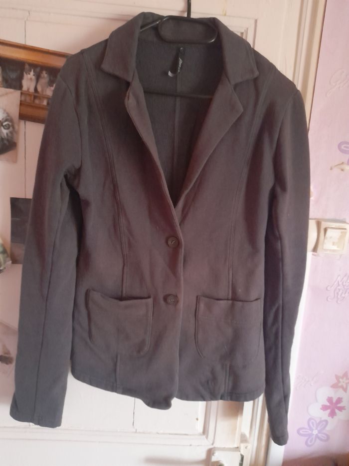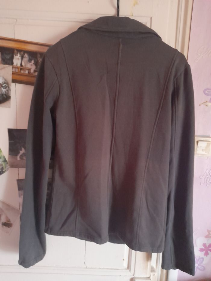 Veste grise en très bon état Elle présente 2 poches et ferme avec 2 boutons. largeur épaules : 42 cm largeur d'aisselle à aisselle : 47 cm hauteur : 64 cm N'hésitez pas à regarder mes autres ventes pour profiter des réductions sur mon dressing !