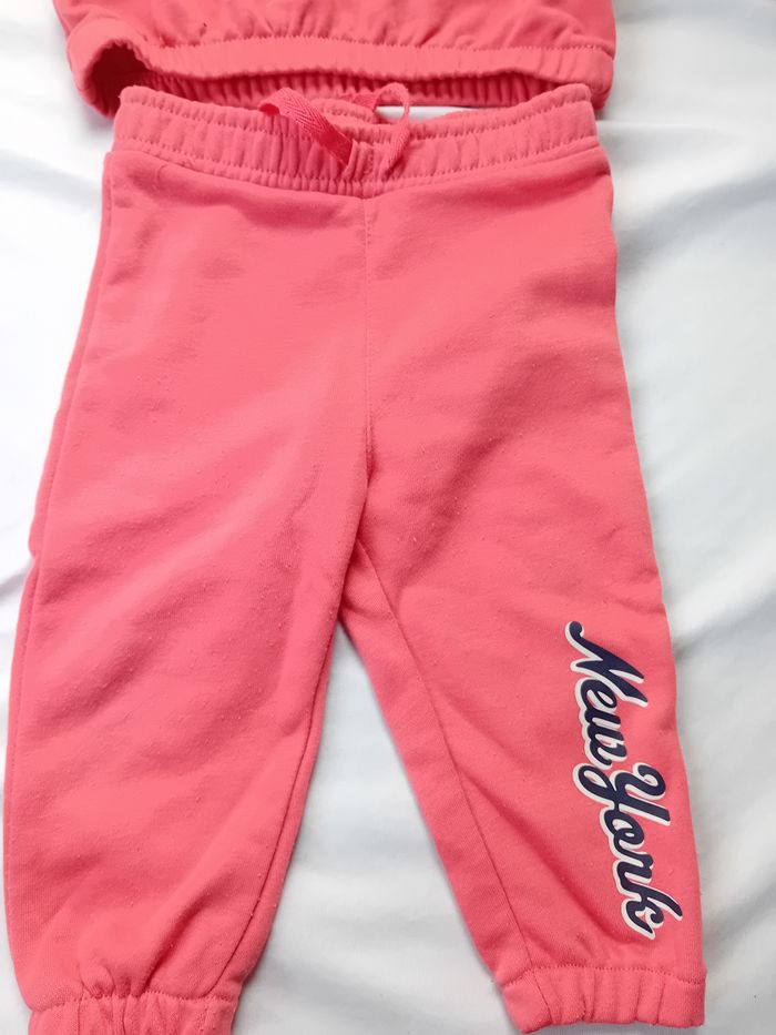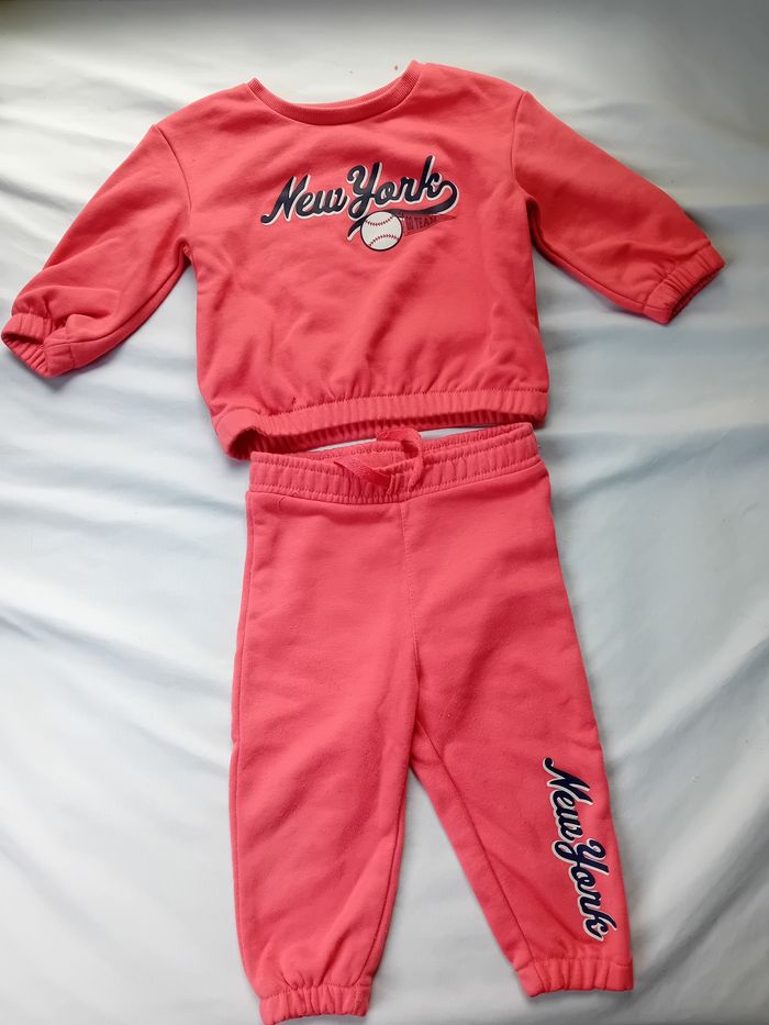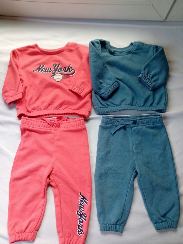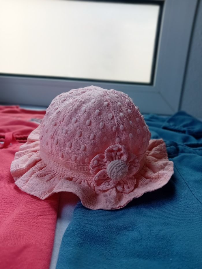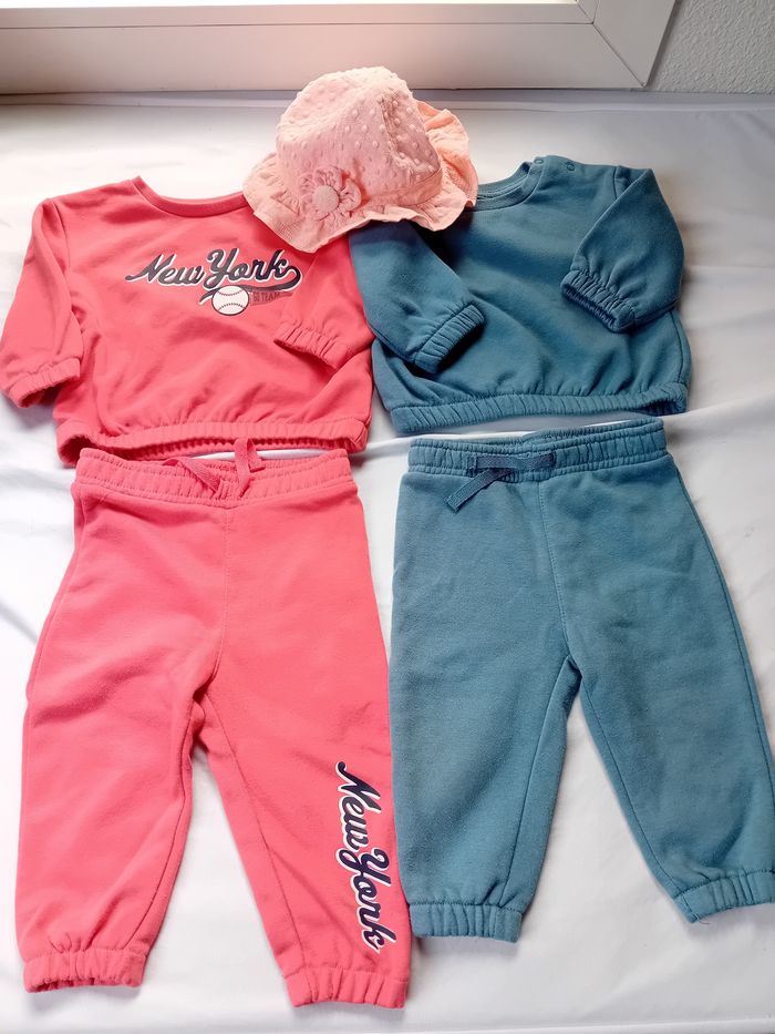 Il y a 2 pulls et e pantalons et un chapeau pour bébé fille 6 à 12 mois