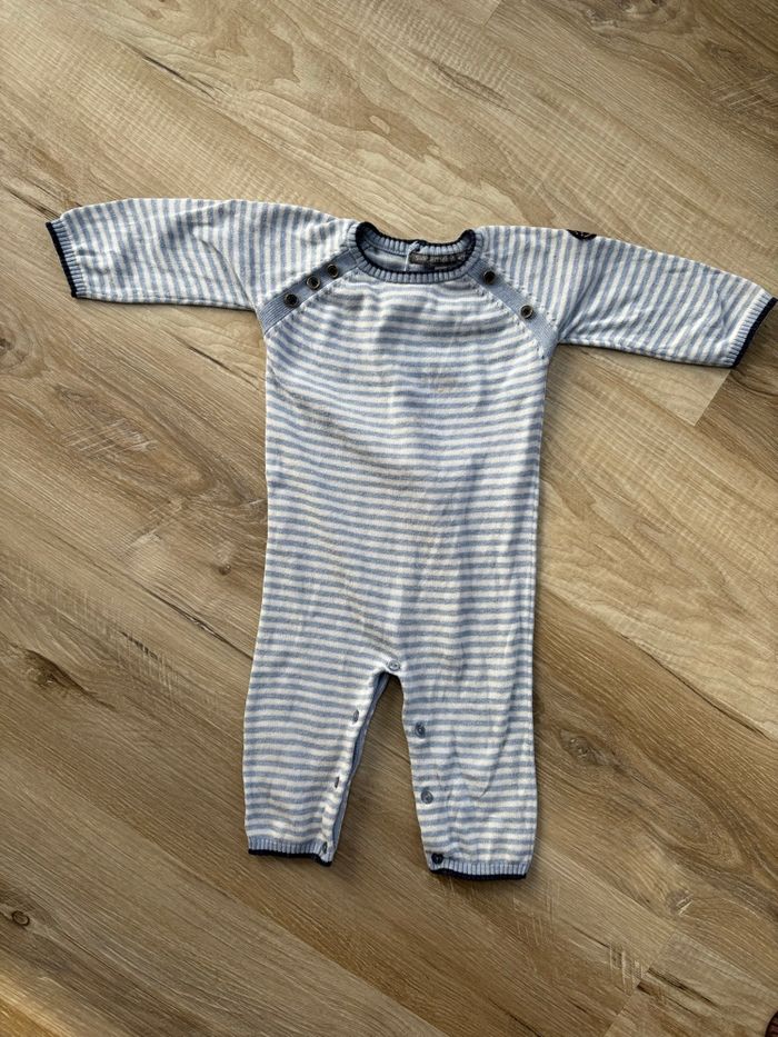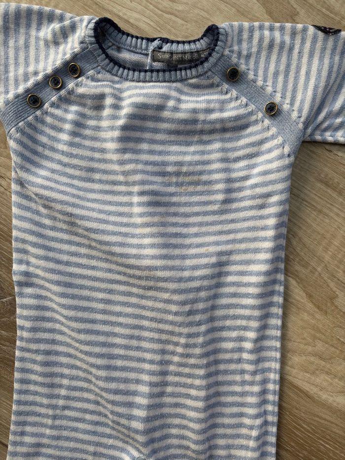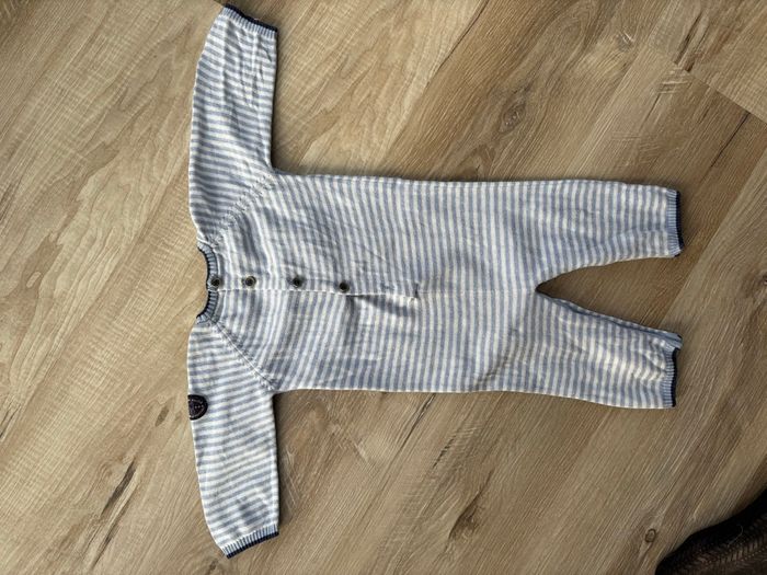 Combinaison/grenouillère garçon taille 9 mois Petites taches sur le devant, ne se remarque pas portée. Manque un bouton à l'arrière mais ne gêne en rien pour la fermeture correcte