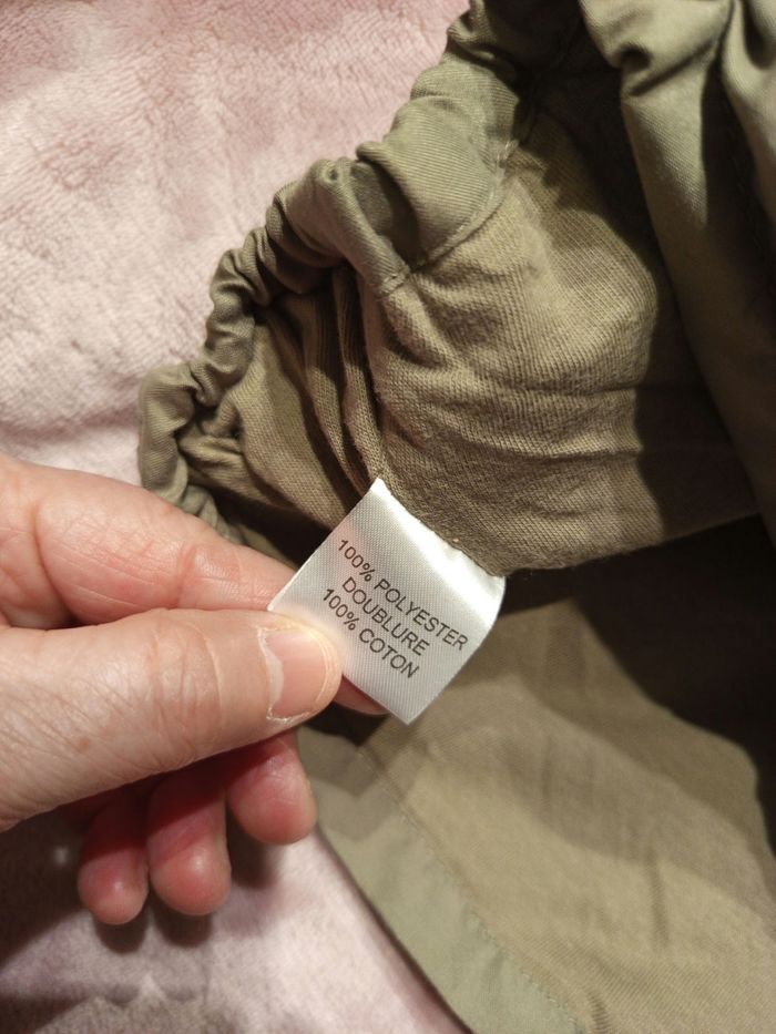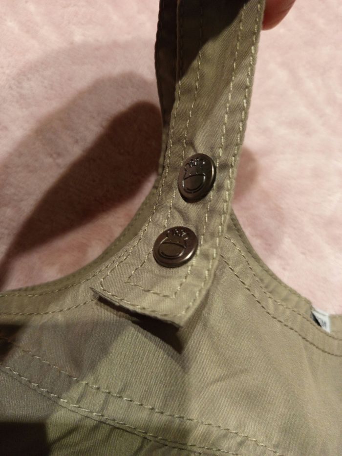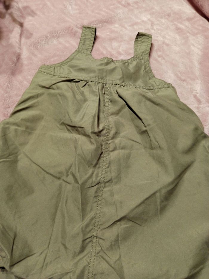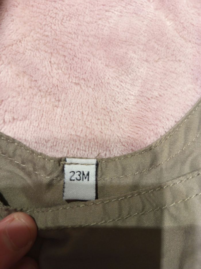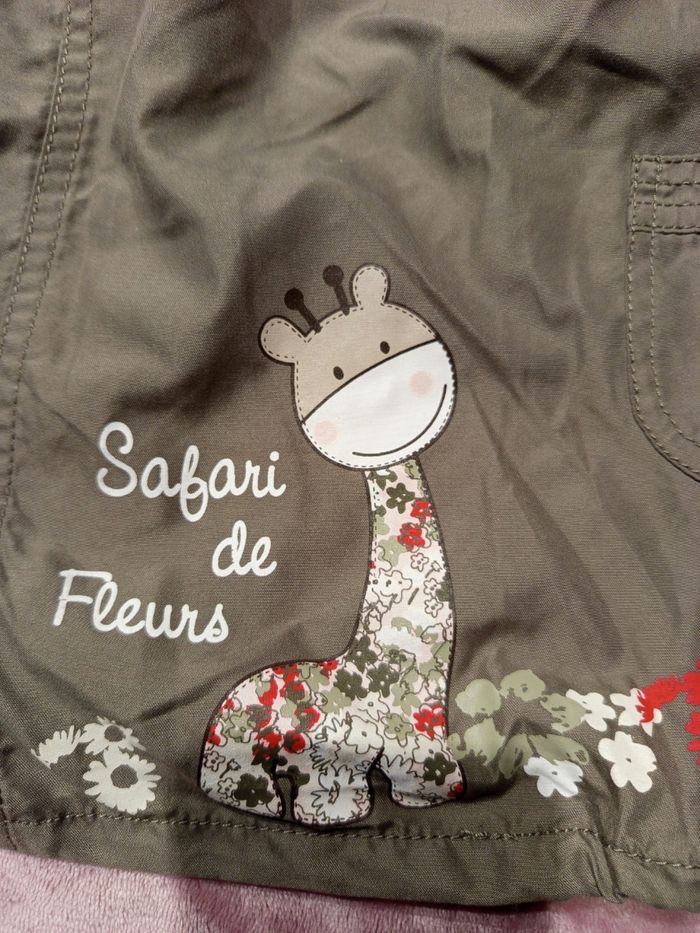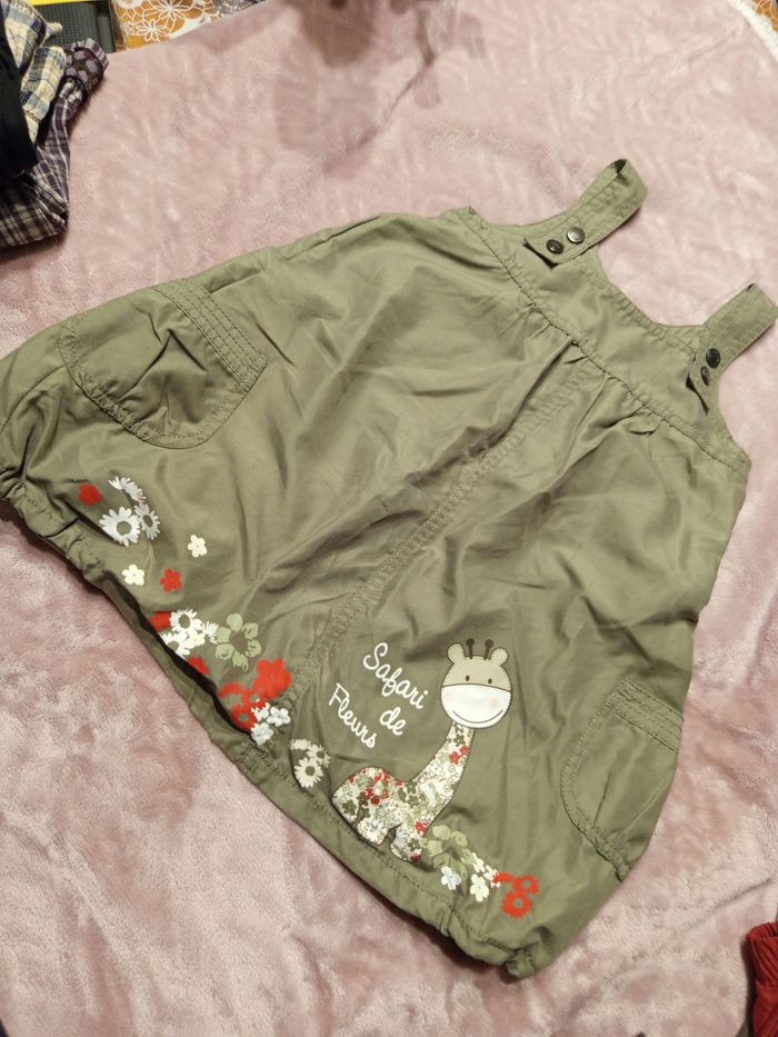 Robe, 23 mois, chaude, kaki, bretelles avec pression 2 positions, imprimé bas de la robe fleurs et girafe, très bon état, en polyester et coton
