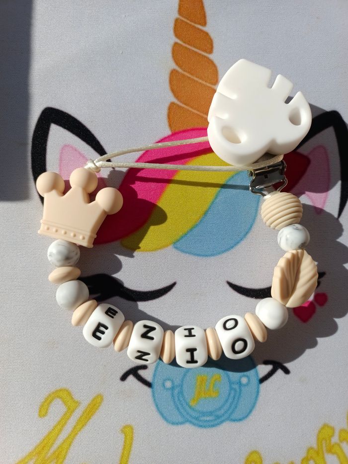 Une Attache tétine Couronne pour ne plus perdre la tétine avec une boucle pour attacher celle-ci (adaptateur MAM disponible pour les tétines MAM dans les accessoires) et un clip pour accrocher l'attache à un tissu sans l'abîmer. Respect des normes CE, composée de perles silicone alimentaire et/ou bois naturel. 100% personnalisable, énormément de choix de clips, perles, etc… Envoyez-moi un message afin de créer main dans la main votre accessoire idéal. Une photo du prototype de celui-ci vous est envoyé pour validation avant envoi.