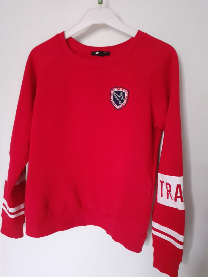 Vends un sweat rouge, 70 % polyester, 30 % coton, molletonné à l'intérieur, marque Jennyfer, taille XS. Longueur de l'épaule à la base : 55 cm Largeur aisselle à aisselle : 45 cm. A noter : porté une seule fois mais les parties blanches sur les manches ont tendance à se craqueler quand on étire le tissu.