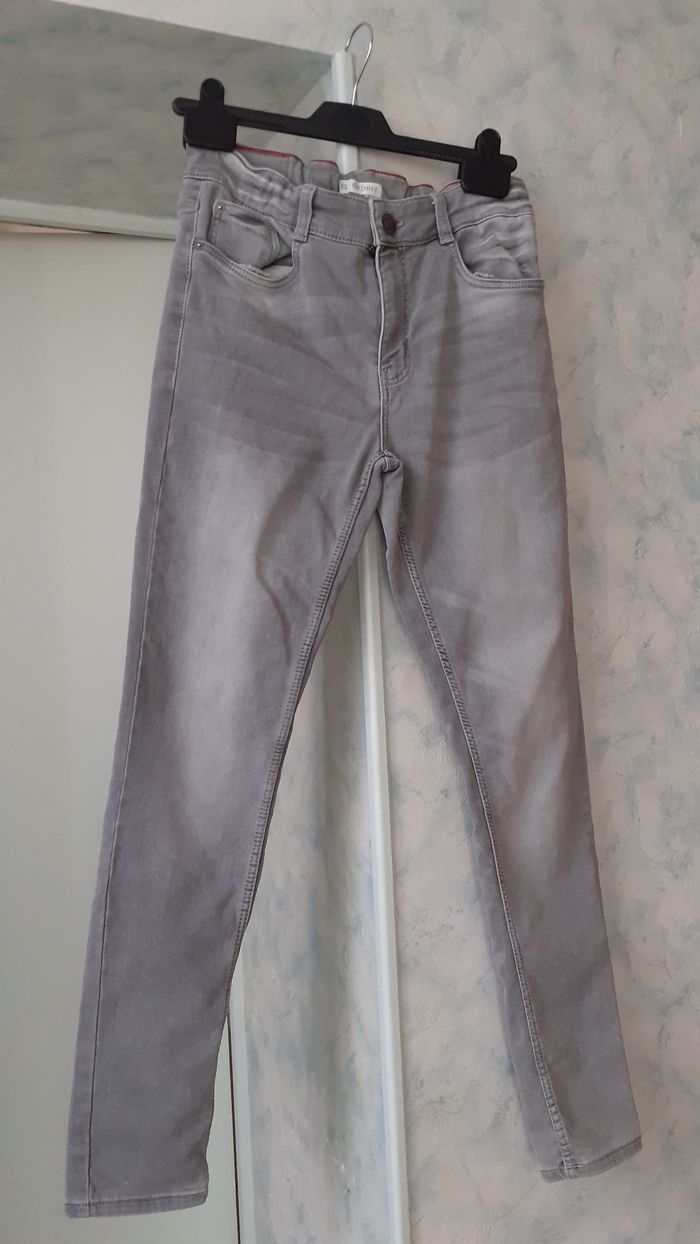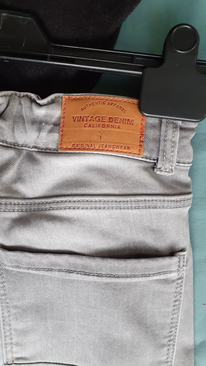 Vends un jean 76 % coton, 21 % polyester, 3 % élasthanne, élastique avec boutons dans la ceinture, couleur gris, marque Kiabi Vintage Denim California, taille XS. Longueur entrejambe : 69 cm Largeur de la ceinture à plat : 36 cm.