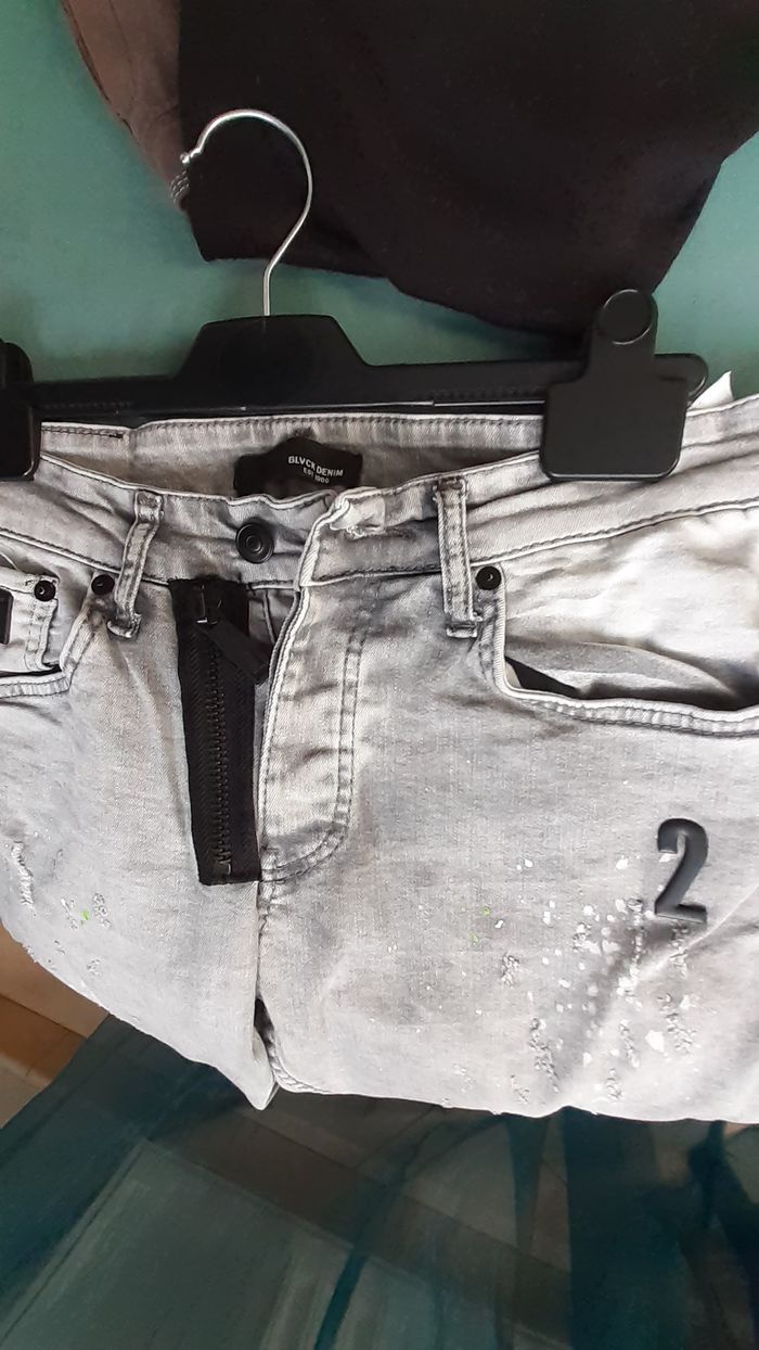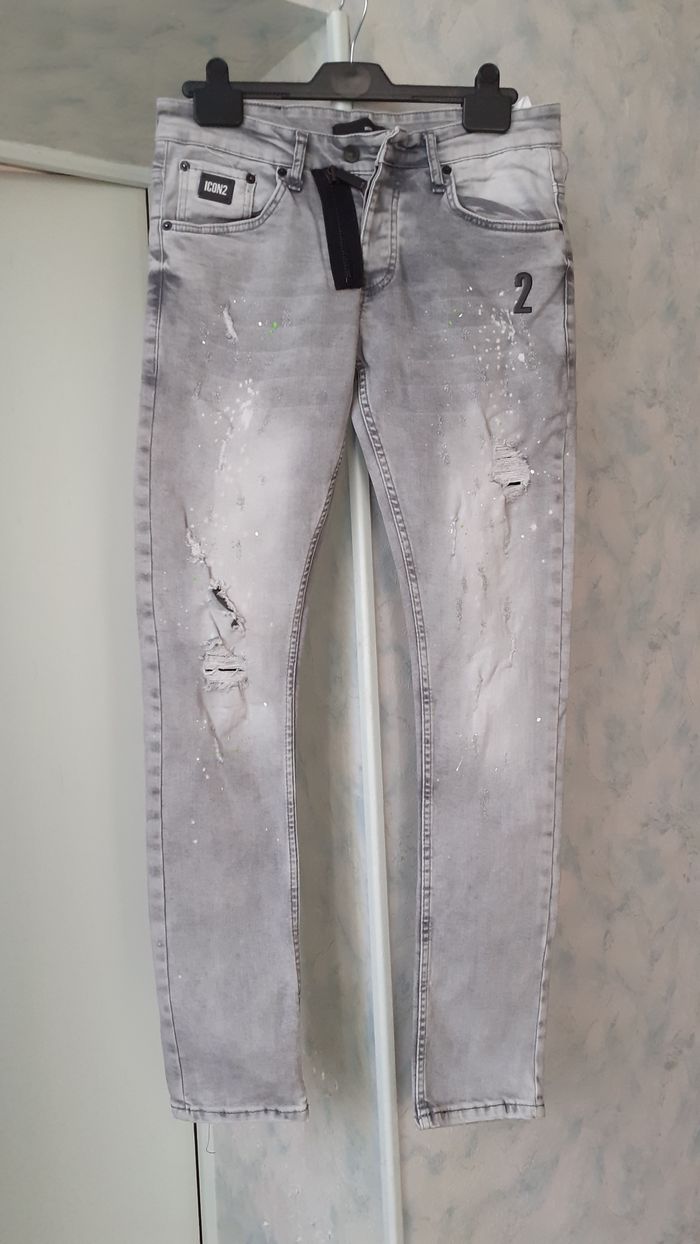Vends un jean troué, 98 % coton, 2 % élasthanne, à double braguette, couleur gris clair avec taches blanches, marque ICON2 Blvck Denim, Est 1988, taille W30 sur l'étiquette. Longueur entrejambe : 77 cm Largeur de la ceinture à plat : 35 cm.
