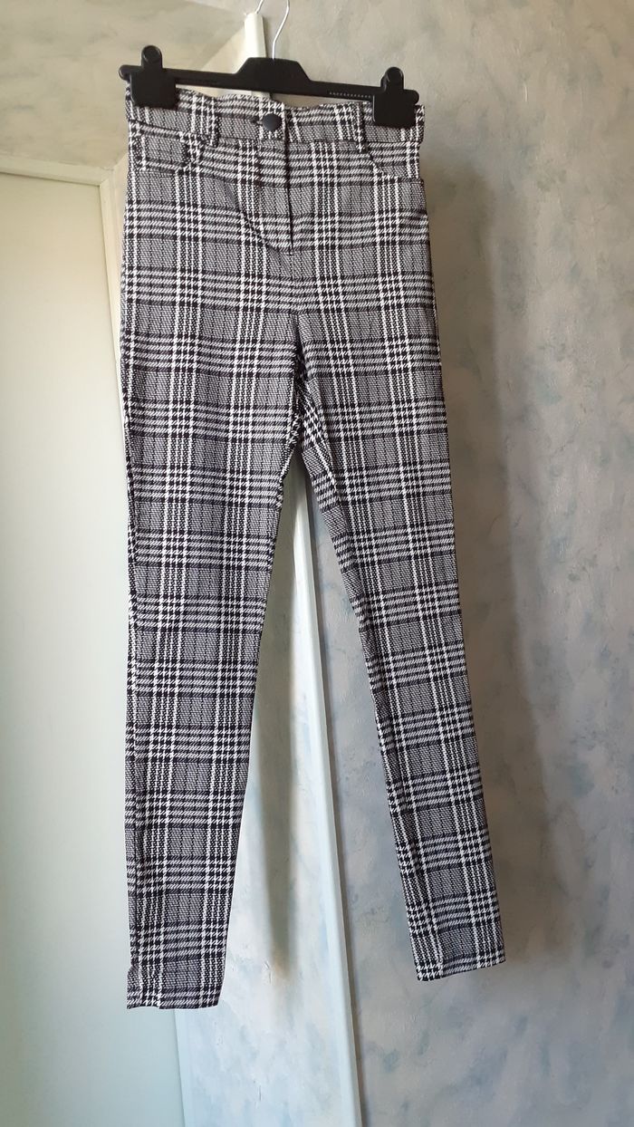 Vends un pantalon slim, 75 % viscose, 11 % polyester, 10 % polyamide, 4 % élasthanne, fausses poches devant, 2 poches derrière, couleur blanc et noir, motif prince de galles, marque Cache Cache, taille 38. Longueur entrejambe : 70 cm Largeur de la ceinture à plat : 37 cm.