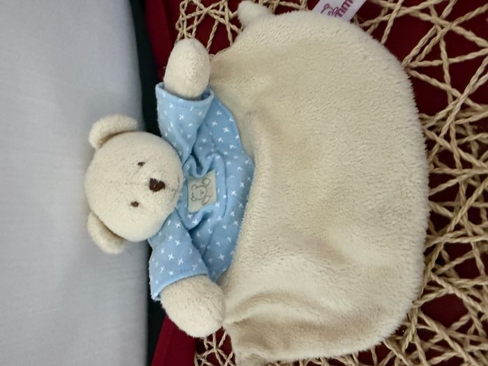 DOUDOU PLAT POMMETTE INTERMARCHE OURS ECRU BLEU ETOILES GRELOT - photo numéro 2