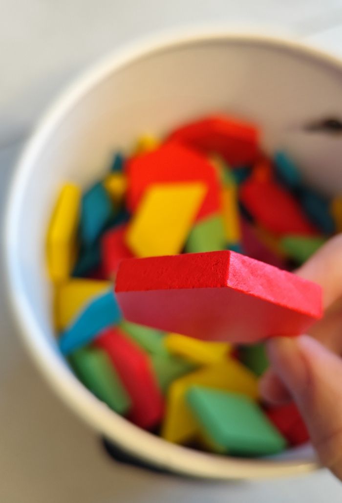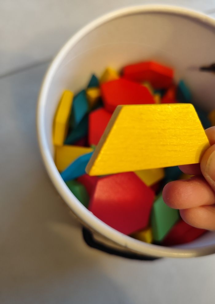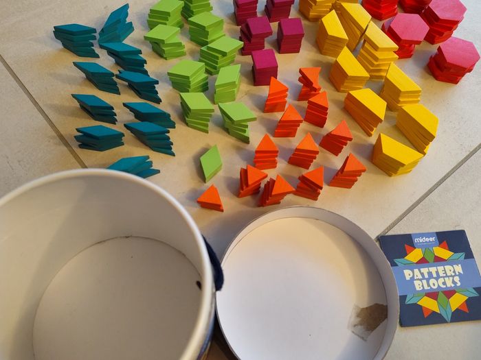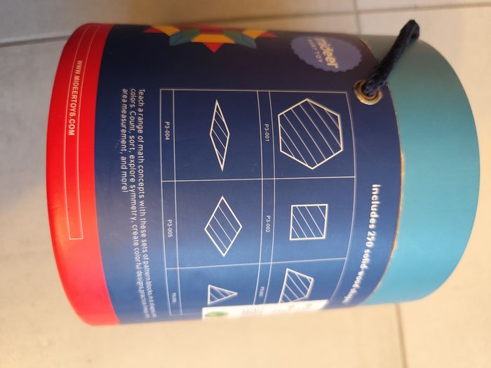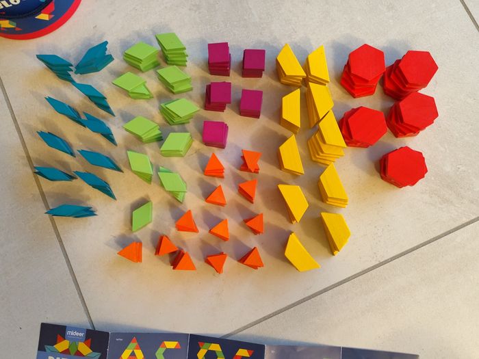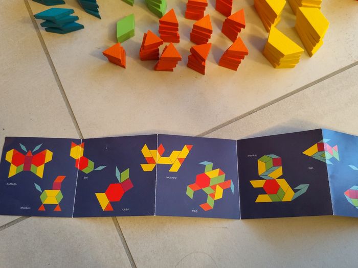 Jeu de construction en bois, type tangram. Marque Mideer. +250 pièces au forme et couleur différentes : orange, jaune, violet, bleu, vert. Dès 3 ans. Jeu d'apprentissage des mathématiques et de la manipulation. Idéal pour le développement de la conscience spatiale et la reconnaissance des couleurs. Boîte de rangement (sceau) avec anse en ficelle. Très bon état, complet avec petit livret de forme à réaliser. Quelques pièces supplémentaires. Le papier au dos du couvercle est un peu abîmé, cf photo. #jouetmowglie12
