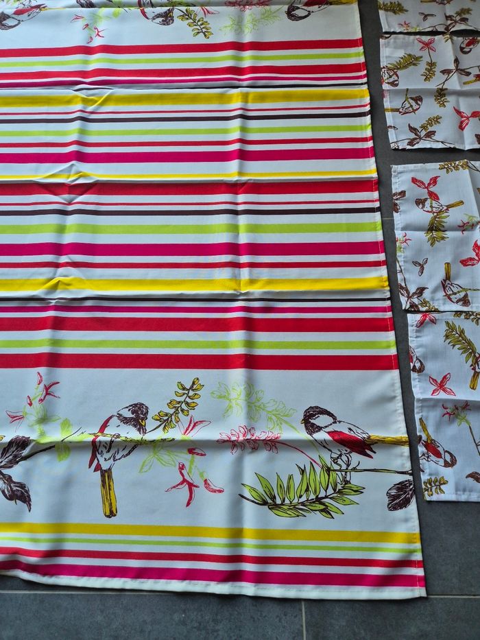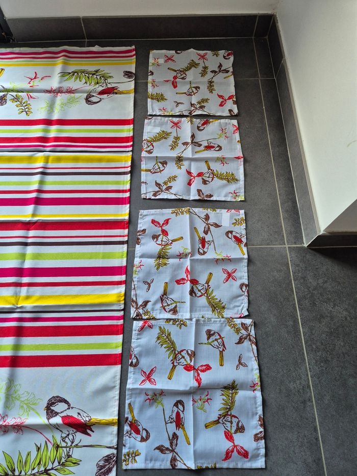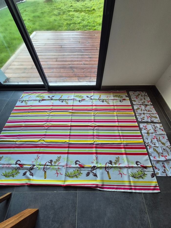 Nappe 180×137 cm 4 serviettes oiseau 30×30 Etat neuf dans emballage d origine Jute ouvert pour prendre photo et Dimension