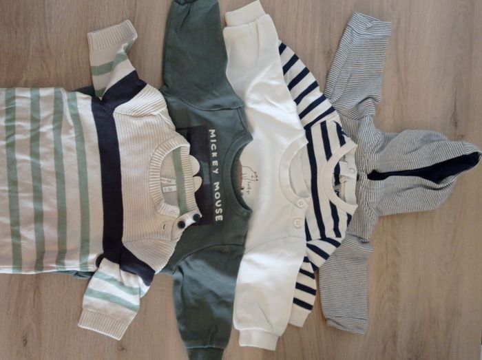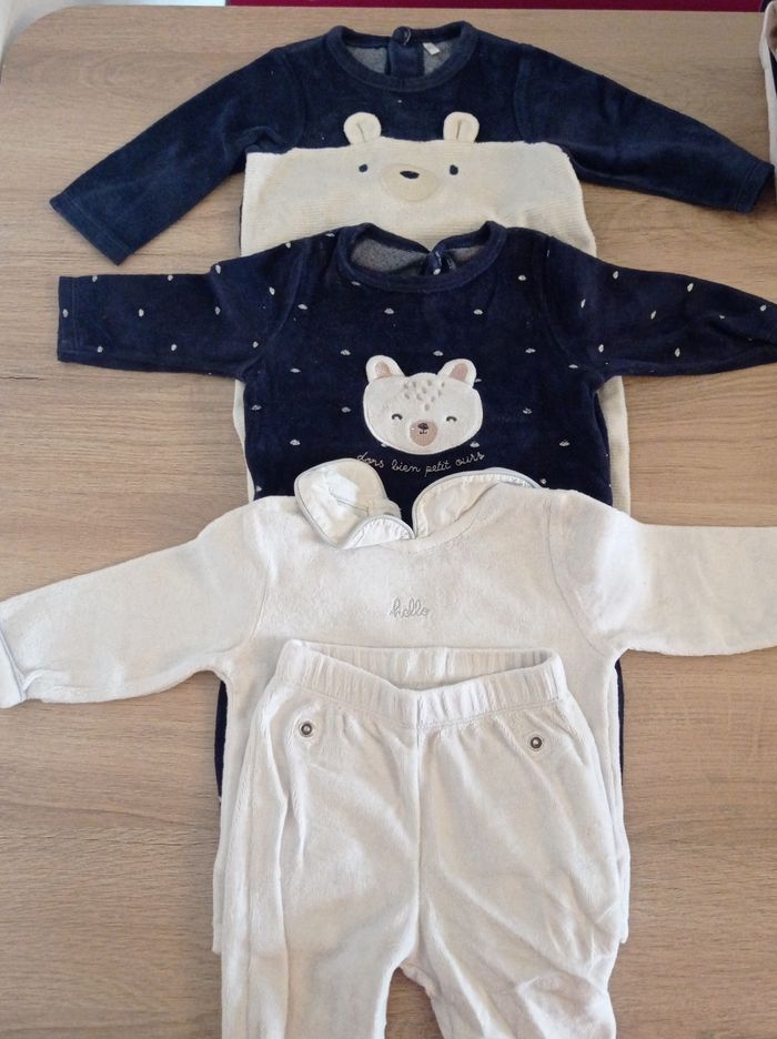 Vend lot de vêtements comprenant: 9 pyjama dont 1 pyjama 2 piece 14 bodies manches longues dont 6 ouverture devant 3 pull en laine 5 pull dont 1 avec capuche 1 ensemble 3 jean 1 survêtement 2 veste 1 leggings 1 gilet 2 combi pilote Marque: Kiabi Orchestra Gemo Kitchoun Kids style collection Sergent major Bout chou Bébé rêve In extenso baby Tex baby Kimbaloo Disney H&M