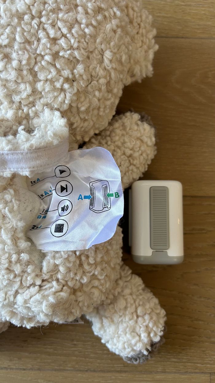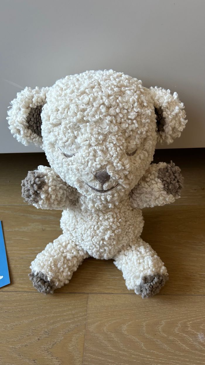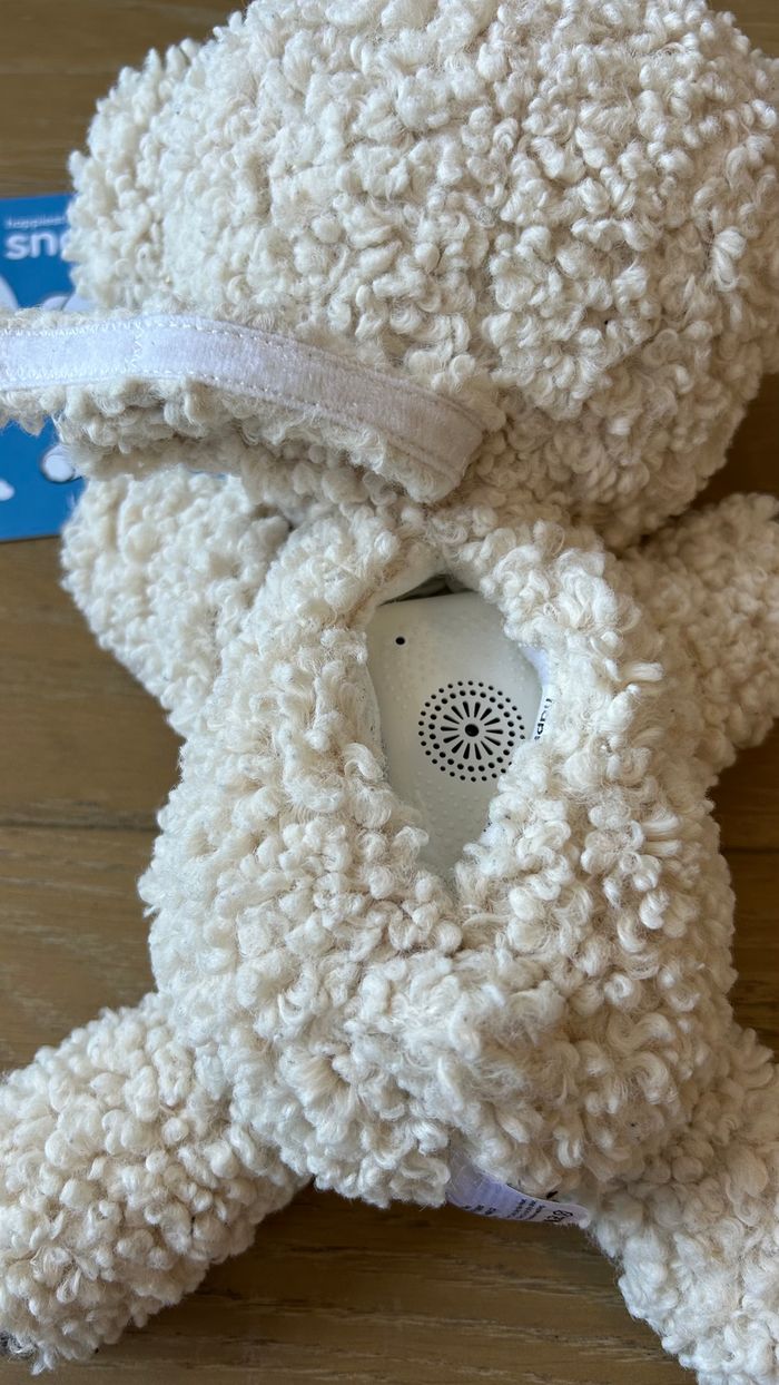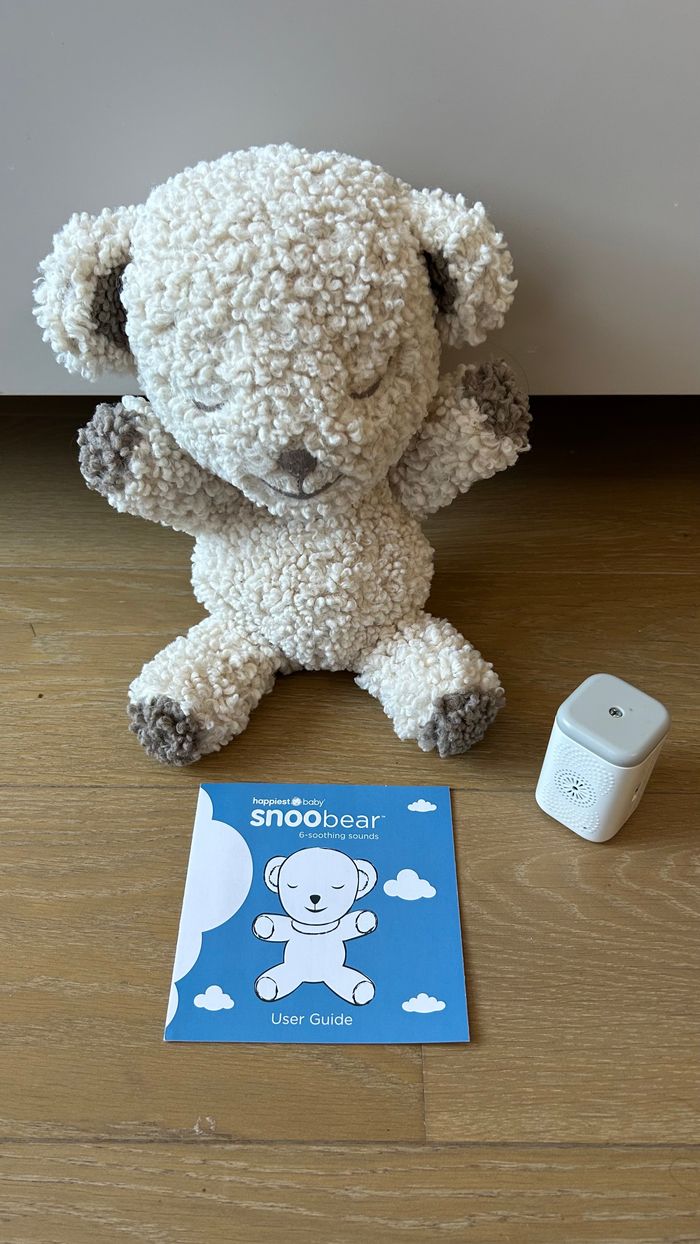 Peluche bébé SNOObear 3-in-1 bruits blancs de Happiest Baby SNOObear est un appareil à bruits blancs, une peluche et une marionnette amusante, réactive et portative, idéale pour les bébés et les tout-petits ! Il apaise rapidement les agitations de votre bébé et l’aide à s’endormir. Ce petit ourson en peluche diffuse pour votre bébé les différents bruits blancs pendant 30 ou 60 minutes, mais une fois que le son s’est éteint, SNOObear continue de surveiller le sommeil de votre bébé et se rallume automatiquement à la moindre agitation. SNOObear a également une sangle pour vous permettre de suspendre en toute sécurité ce compagnon sur la poussette ou le siège auto lorsque vous êtes en déplacement. Les différents sons : Pluie sur le Toit : Sons de Base, Niveau 1 et Niveau 2 de SNOO Chut Rapide : Imite le chut rapide d'un parent, bon pour apaiser les pleurs Sèche-cheveux Puissant : Son Niveau 3 de SNOO Chut Lent : Imite le chut doux d'un parent Rapide et Énergique : Son Niveau 4 de SNOO Train : Bourdonnement bas et rythmique SNOObear est fourni avec : 1 ourson en peluche à câliner multiusage (avec sangle de transport) 1 haut-parleur blanc amovible, portatif et compact 2 piles AA Couleur : cream wooly Etat : très bon état Prix : 22 euros Remise en mains propres sur Paris 11ème ou envoi via un relais (pas de locker) #bebe #peluche #doudou #sommeil #bruitblanc #snoo