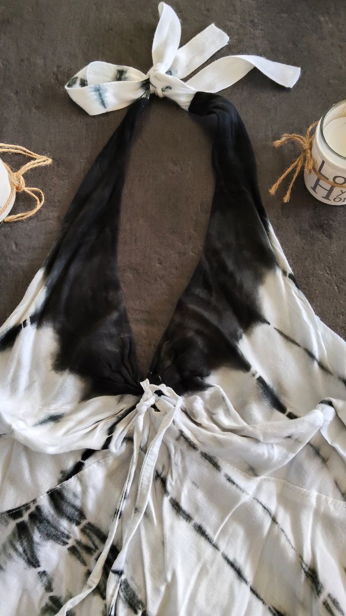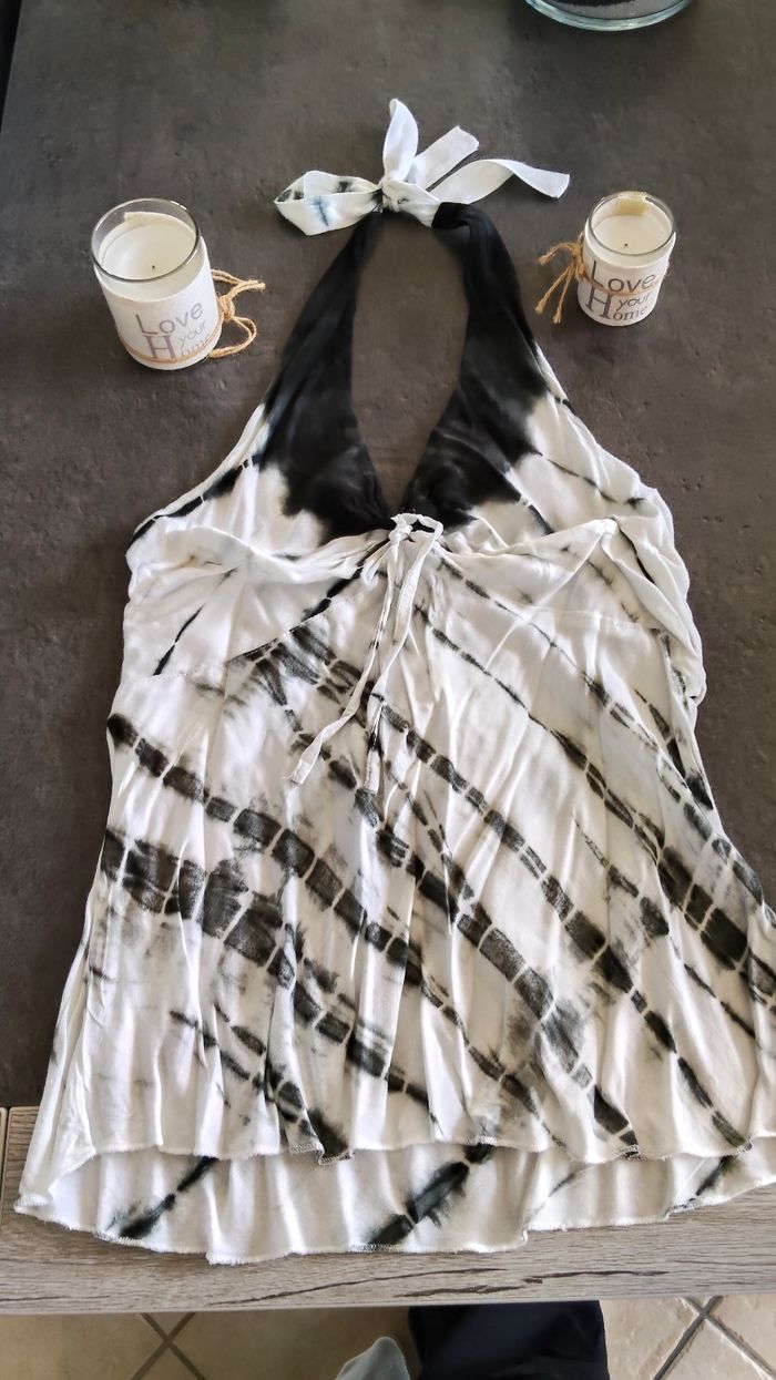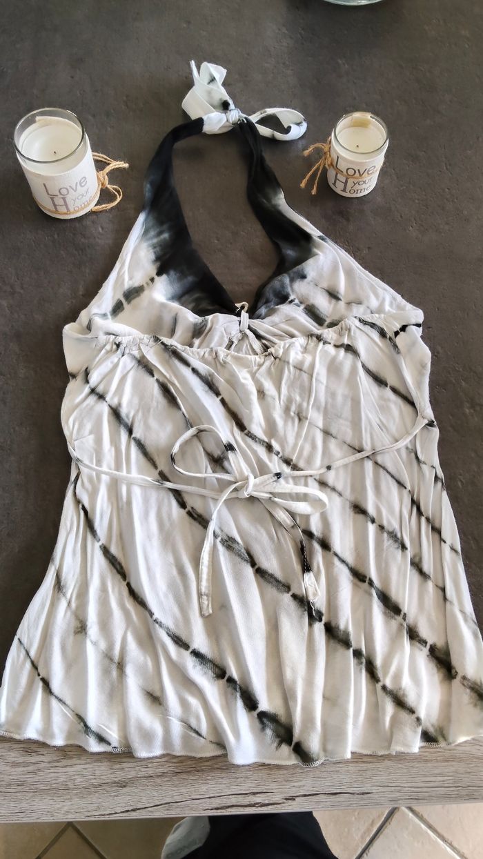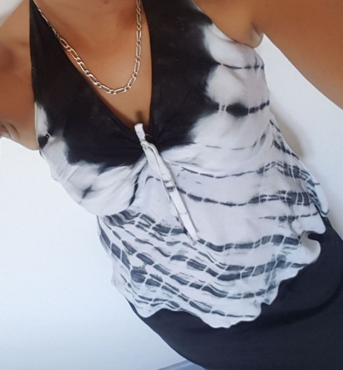 Débardeur dos nus, pas de taille donc je vais mettre les mesures et j'ai mis une ancienne photo où je le portais. De souvenirs, il a été acheté comme taille unique, mais correspond à un 34/36/petit 38 je dirais. Pas déchiré mais un petit point de couture à faire (cf.photo) Je vous laisserais le soin de le repasser ;) Lien dans le dos et élastique Longueur sous bras au bas : 43 cm repassé Longueur sous bras : environ 40 cm étiré à moitié Pas de tâche ni de trou N'hésitez pas à me demander pour plus de détails #thethe27femme34 #thethe27femme36 #thethe27femme38