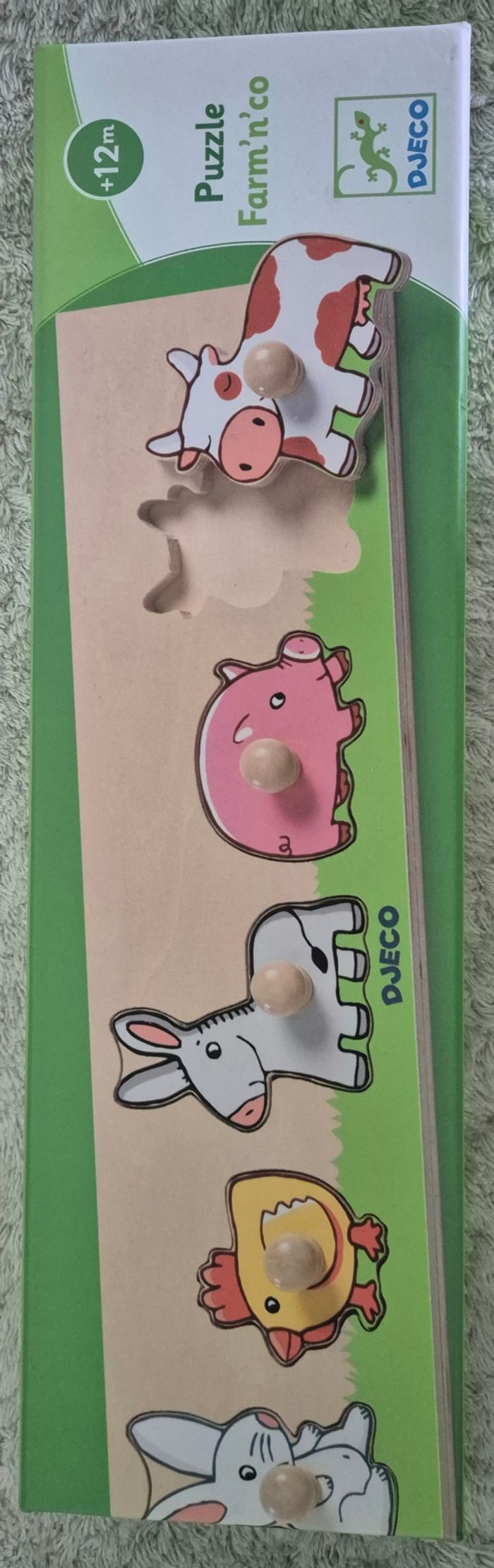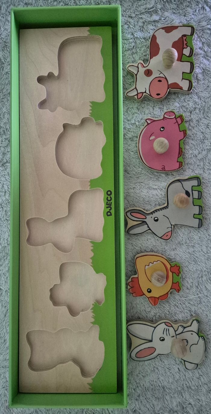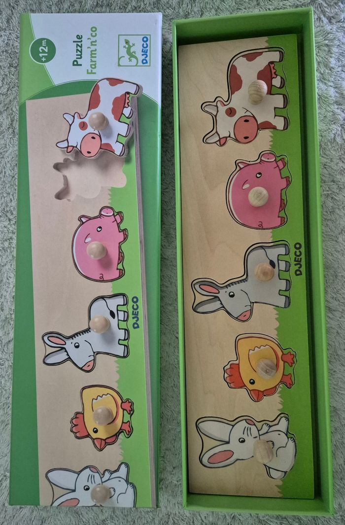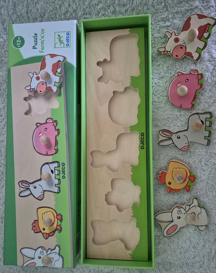 Puzzle Djeco animaux de la ferme En bois En parfait état sauf la boîte légèrement abîmée comme montré sur la dernière photo. À partir de 12 mois