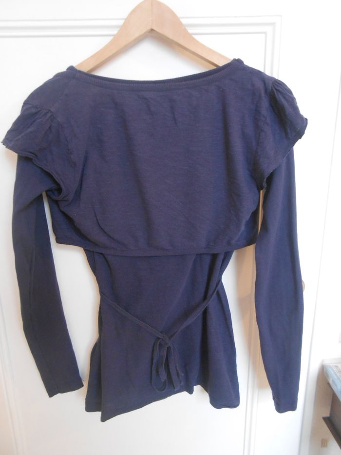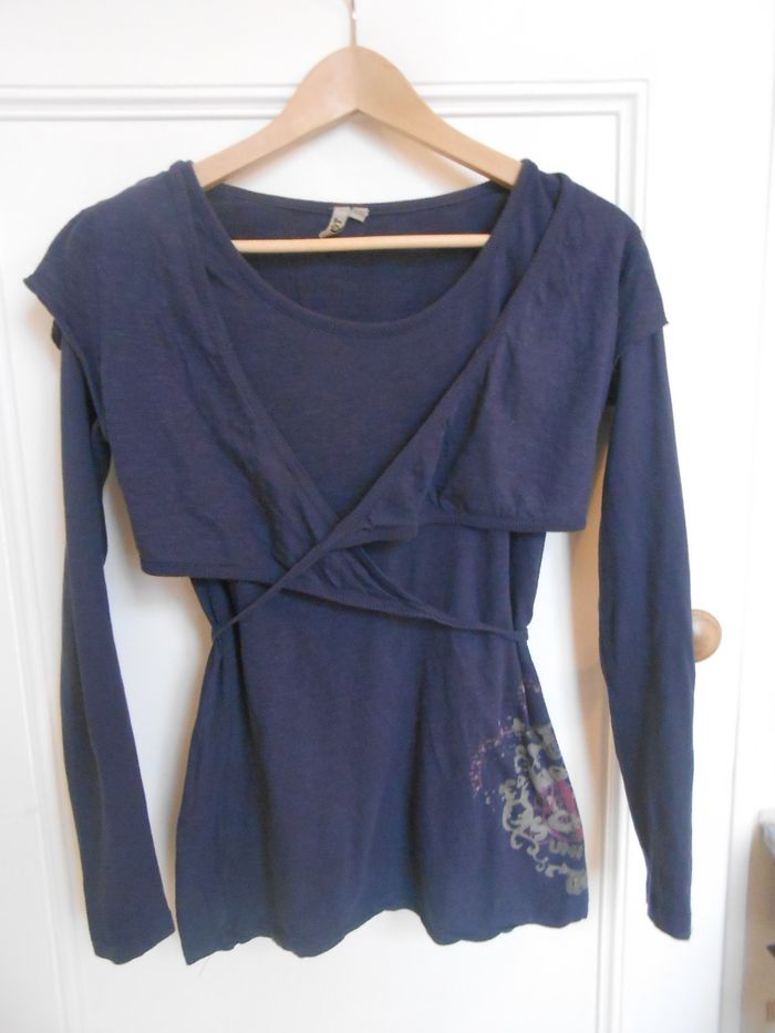 Ensemble T-shirt + cache-cœur assorti cousus ensemble au niveau des épaules. Un lien permet de fermer le gilet. Couleur violet. Excellent état. Marque Spot. Composition : 100 % coton (voir photo). Longueur : 59 cm Largeur aisselle à aisselle : 37 cm