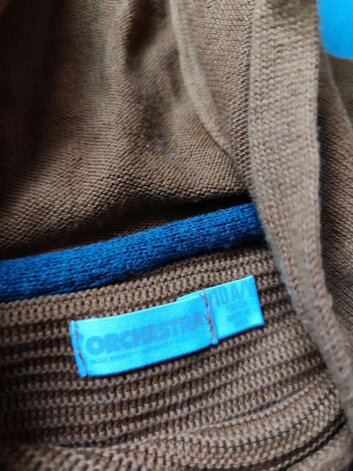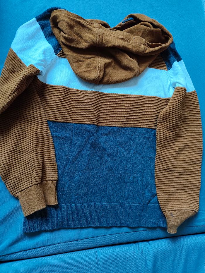 Joli pull fin à capuche tricolore (rouille, gris et blanc). Ce modèle estival ou de mi-saison allie le confort d'un sweat et la légèreté d'une maille fine. On apprécie ses détails texturés à rayures en relief. ⚠️ À noter : Le pull présente deux petites taches discrètes (une sur la partie blanche à l'avant et une sur la manche), visibles sur les dernières photos. 🔸 Marque : Orchestra 🔸 Taille : 10 ans (140 cm) 🔸 État : Très bon état global (précision ci dessus)