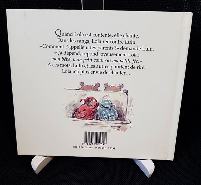 Quand Lola est contente, elle chante. Dans les rangs, Lola rencontre Lulu. "Comment t'appellent tes parents ?" demande Lulu. "Ça dépend, répond joyeusement Lola : mon bébé, mon petit coeur ou ma petite fée." A ces mots, Lulu et les autres pouffent de rire. Lola n'a plus envie de chanter... Prix Neuf indicatif actuel : 12,00 E. Édition cartonnée Format 206x175 EAN 9782211052597 mai-00 Très Bon État, juste quelques légères marques/salissures sur couvertures, intérieur TBE, sans écritures. Une imposante liste de livres pour enfants disponible, essayez un premier contact :) Poids : 250 g