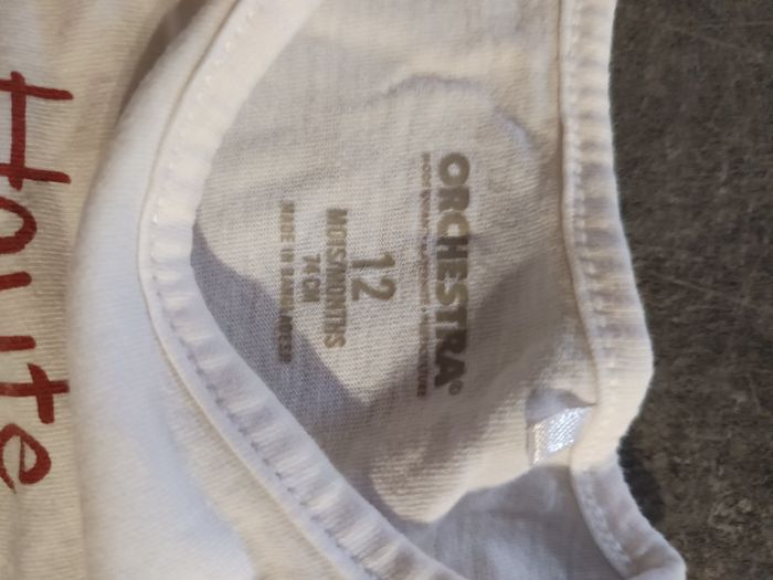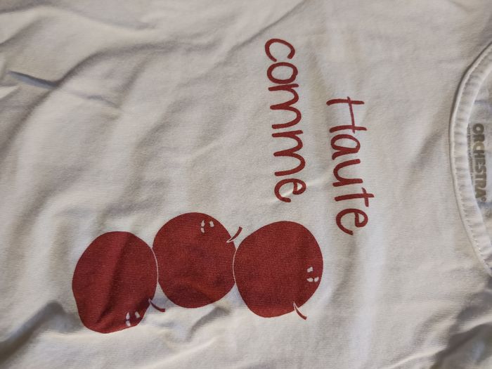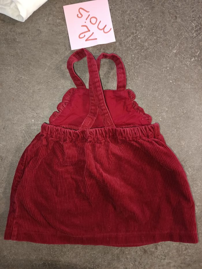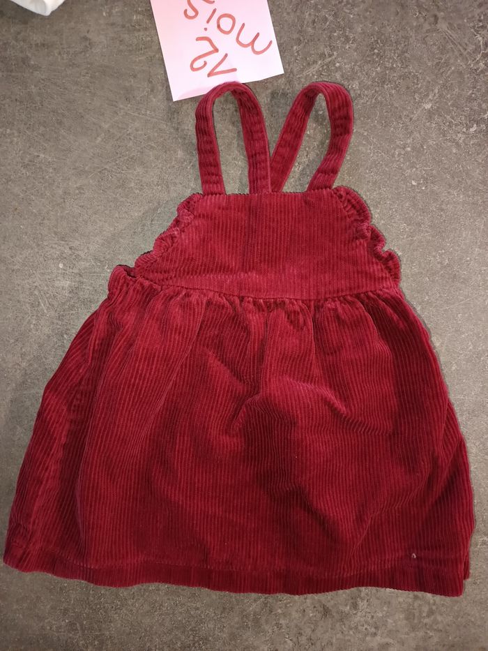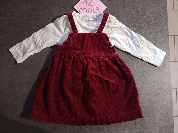 Ensemble 2 pièces : - 1 haut blanc manches longues avec inscription "haut comme 3 pommes" (orchestra) - 1 robe en velours bordeaux (Kiabi), bretelles réglables. NEUF jamais porté ! Taille 12 mois