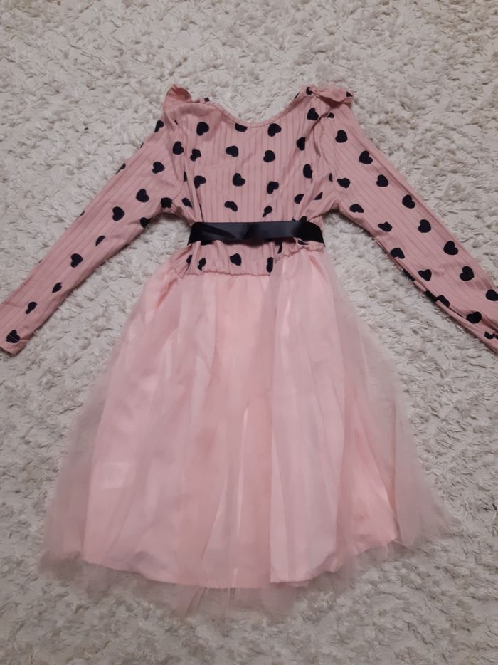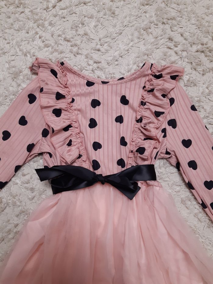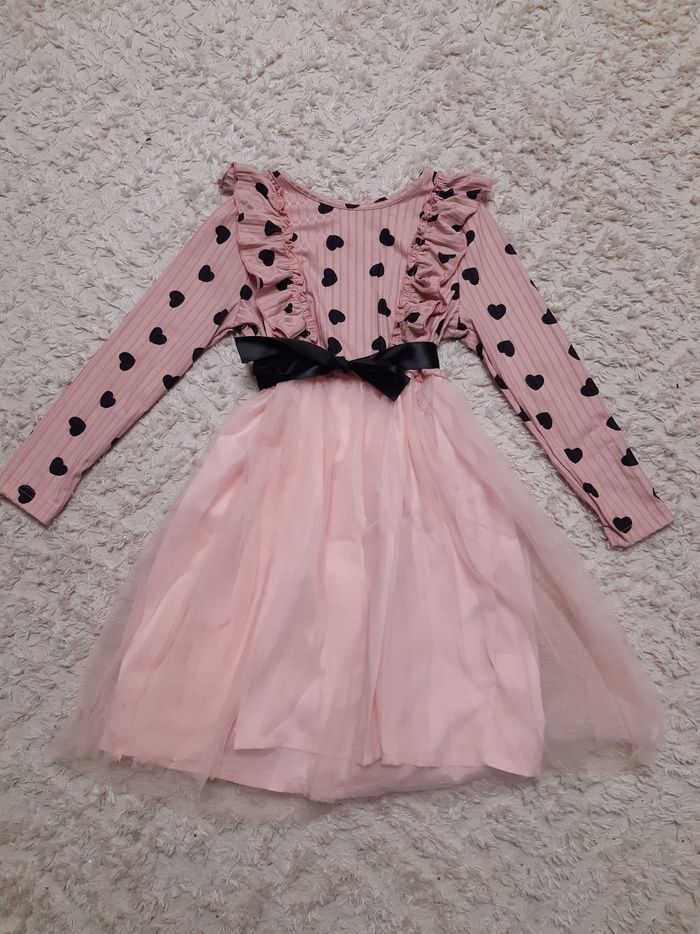 Bonjour 👋 Robe fille taille 7 ans, élégante et douce. Haut rose poudré à motifs cœurs noirs, manches longues avec volants raffinés. Taille marquée par un joli nœud noir. Jupe en tulle léger et vaporeux pour un effet princesse. Idéale pour les fêtes, cérémonies ou occasions spéciales. 💗 Robe neuve jamais portée