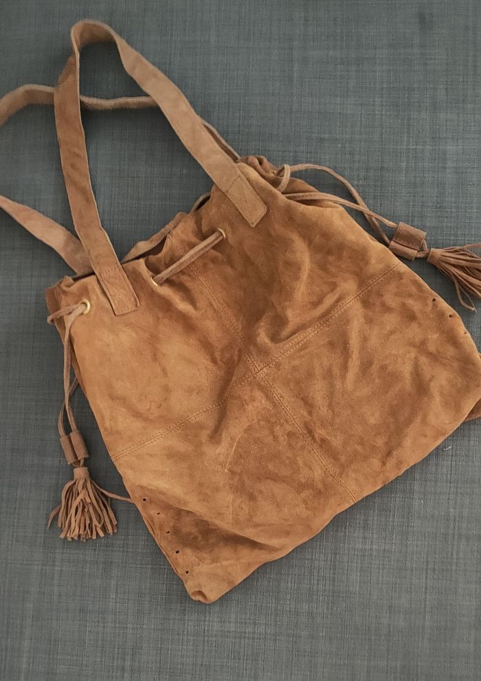 Grand sac Promod. Bon état général. A été utilisé mais ne présente pas de gros défauts. Légèrement abîmé dans les coins. Photo 2 à l'appui. A l'intérieur, assez grand à l'intérieur il contient une poche et deux autres petites. Matière principale : cuir croûte de vache Intérieur : coton Largeur : 42 cm Hauteur : 39 cm