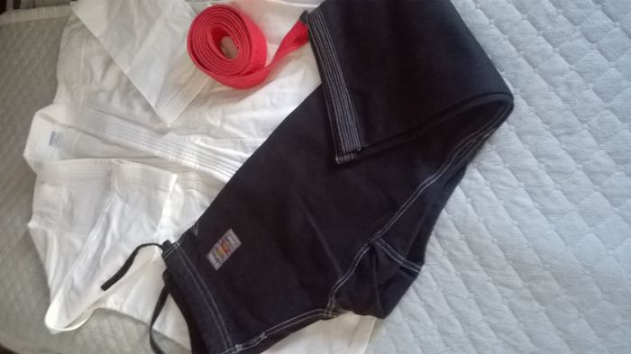 veste blanche pantalon noir taille 170 marque Décathlon modèle Okayama 700 état neuf porté une seule fois je donne le ceinture rouge avec