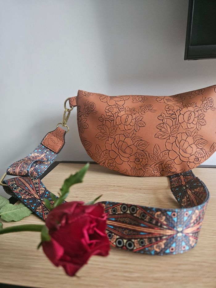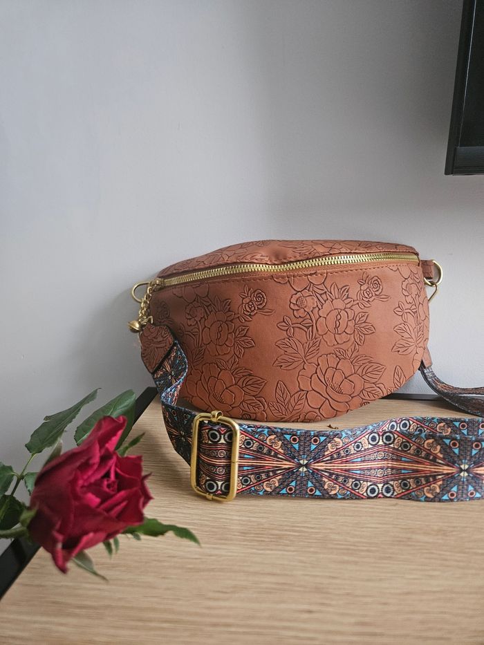 Sac bandoulière / sac banane très élégant en simili cuir marron embossé à motifs floraux. Il est doté d’une large sangle ethnique multicolore réglable, très confortable et tendance. ✨ Détails : Fermeture zippée dorée 1 grande poche principale 1 poche intérieure zippée Intérieur propre et en très bon état Peut se porter à l’épaule ou en bandoulière 24 cm de long 15 cm de haut 📌 État : neuf jamais porté 📐 Style : bohème / chic / quotidien 🎁 Idéal pour toutes les saisons