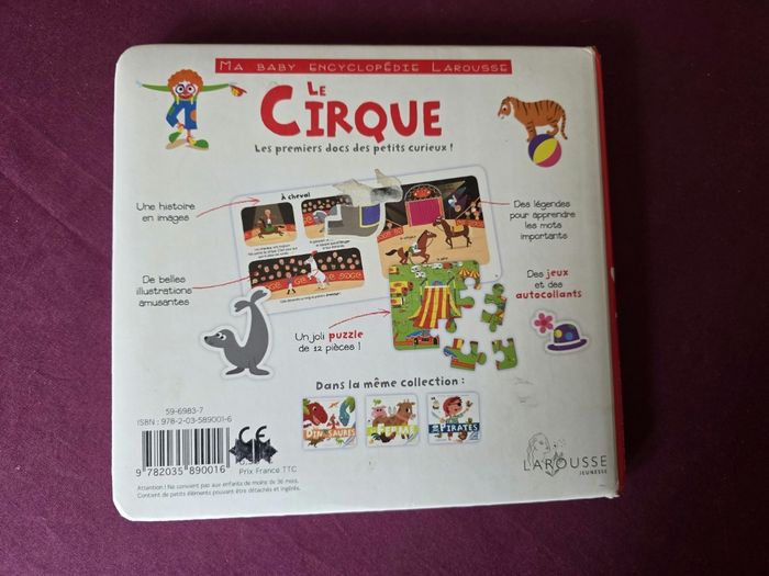 Je vends ce livre " Ma baby encyclopédie Larousse " sur le thème du cirque. Illustré de très belle images et texte simple. Livre éducatif pour découvrir le monde du cirque. Couverture cartonné effet mousse et pages plastifier. Juste la dernière pages où contenait le puzzle qui est déchiré, le puzzle est manquant. Le livre est en très bon état.