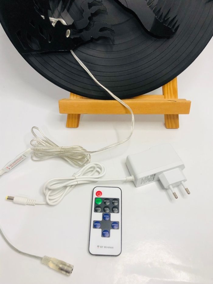 Cadre lumineux (led) réalisé sur disque vinyle 33T Jurassic dinosaure Couleurs: rouge Fourni avec: -Sa télécommande pour changement de densité de la luminosité ainsi pour changement d’effet d’ambiance -Son secteur de branchement doté d’une longueur de +2,7m Présence de quelques micros rayures Bon état