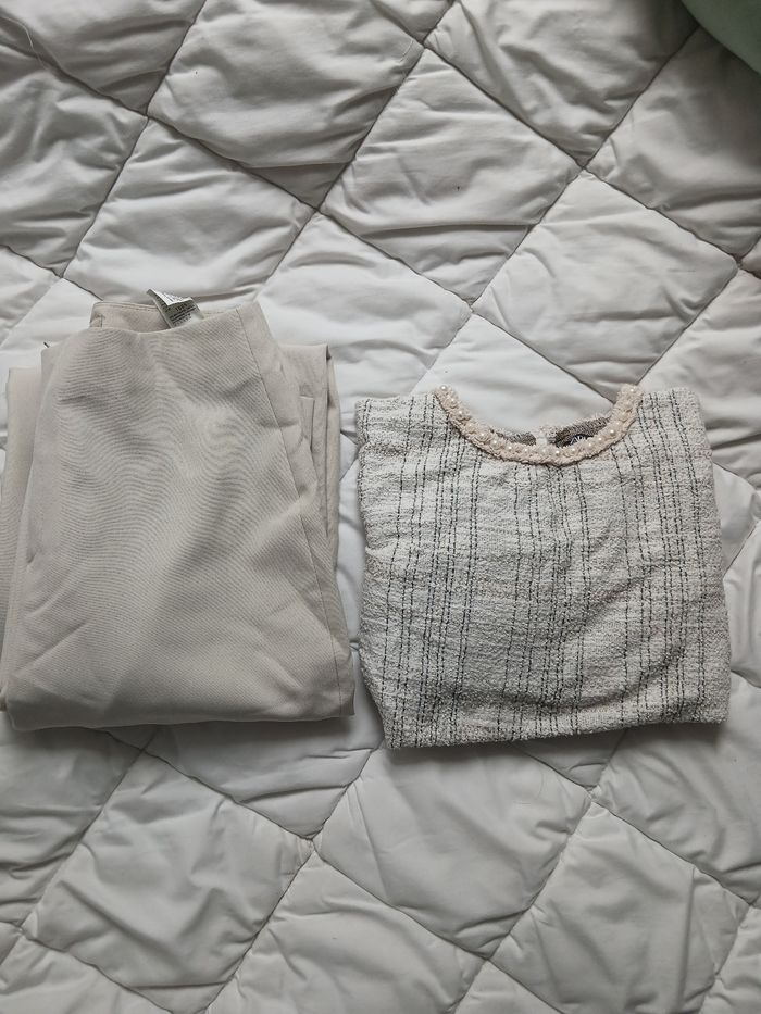 Lot Zara-Ensemble chic - Top tweed perlé & Pantalon fluide crème - photo numéro 1
