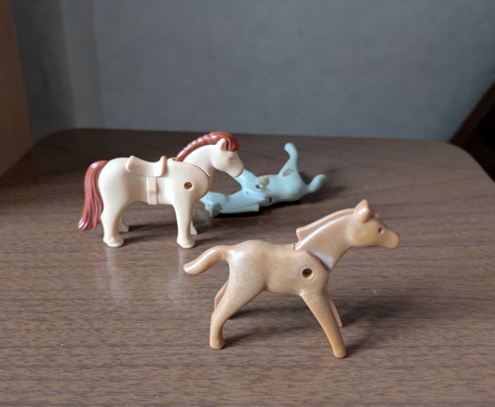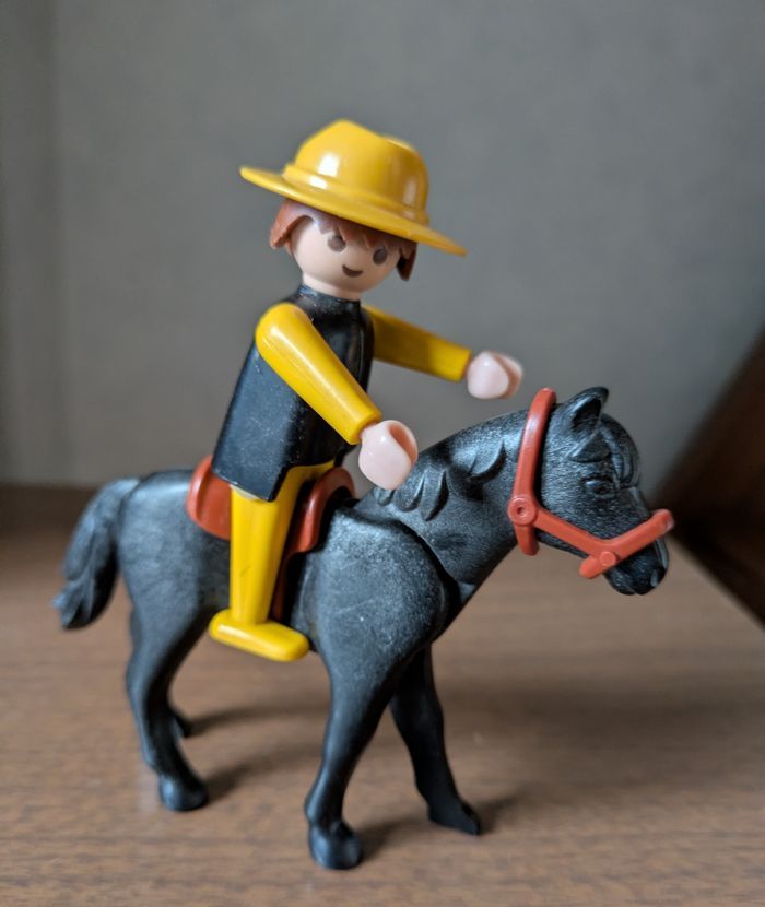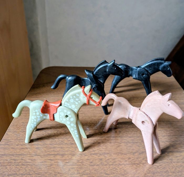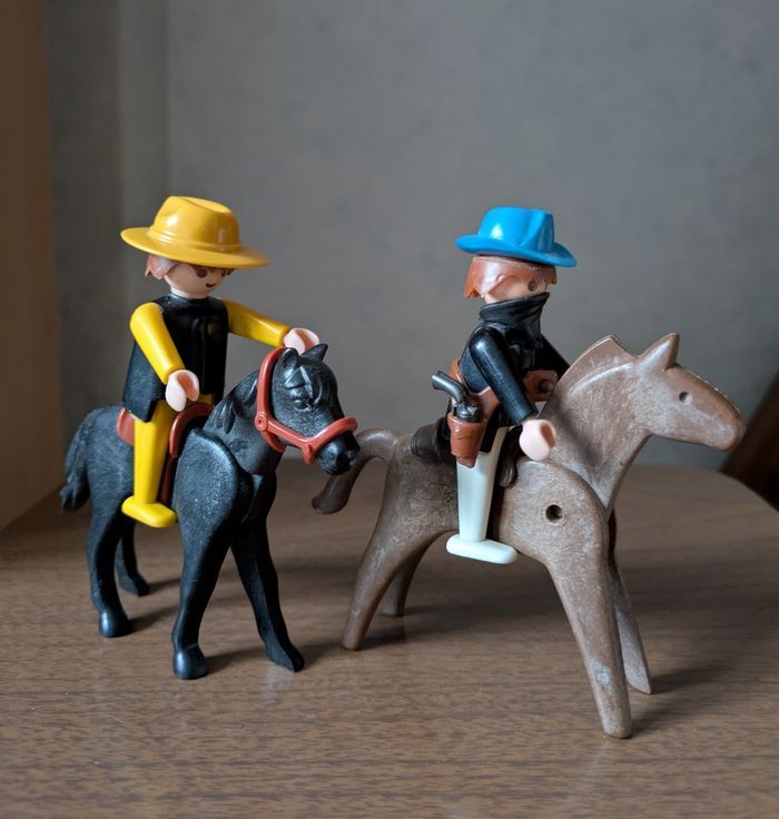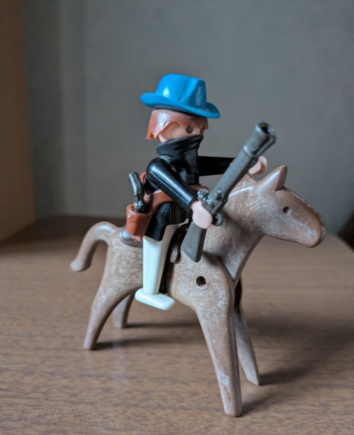 Lot Playmobil vintage années 70 Set western avec un cow boy, un bandit fusil et revolver, 6 chevaux certains avec selles et harnais, 1 poulain et 2 enclos. Je donne un poulain manque une patte plus un cheval non identifié. Possible à l'unité : grand enclos 4€, petit enclos 3€, cowboy avec cheval selle et harnais 5€, bandit masqué avec cheval,son fusil plus revolver à la ceinture 6€, 4 chevaux dont un avec selle et harnais plus un poulain 6€