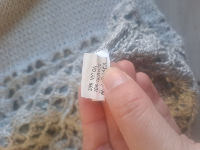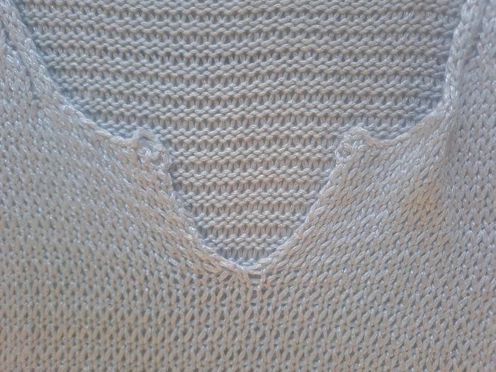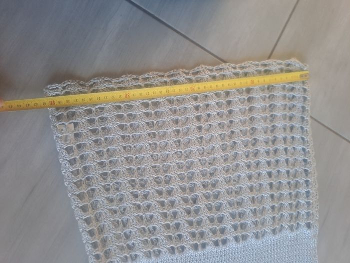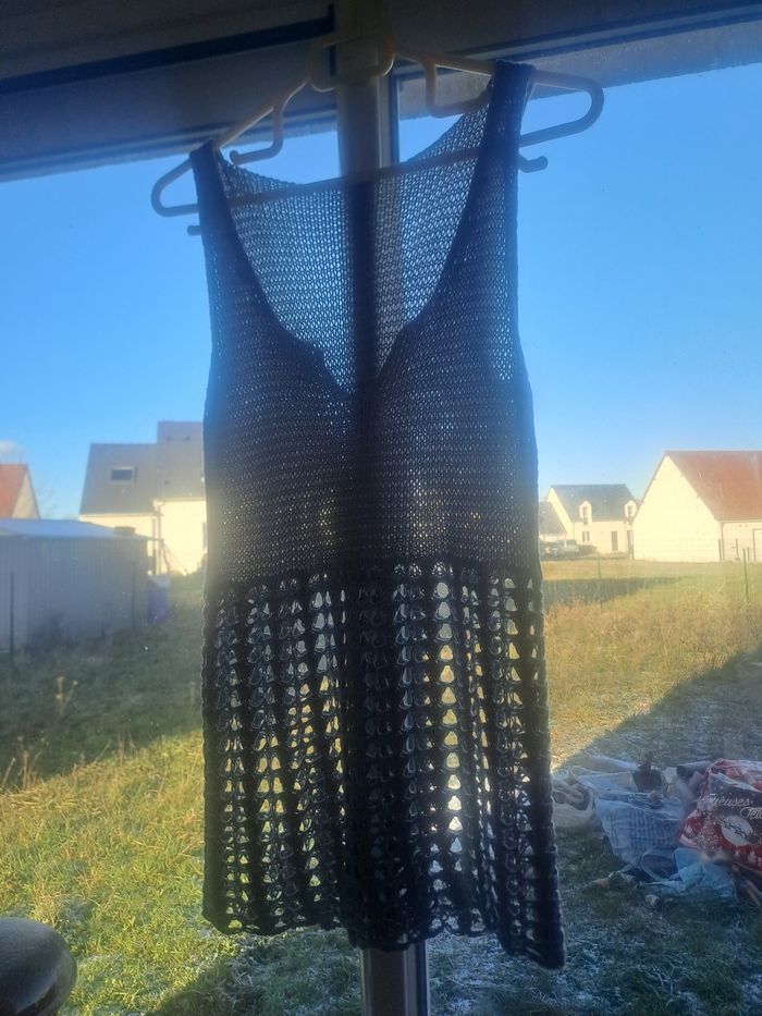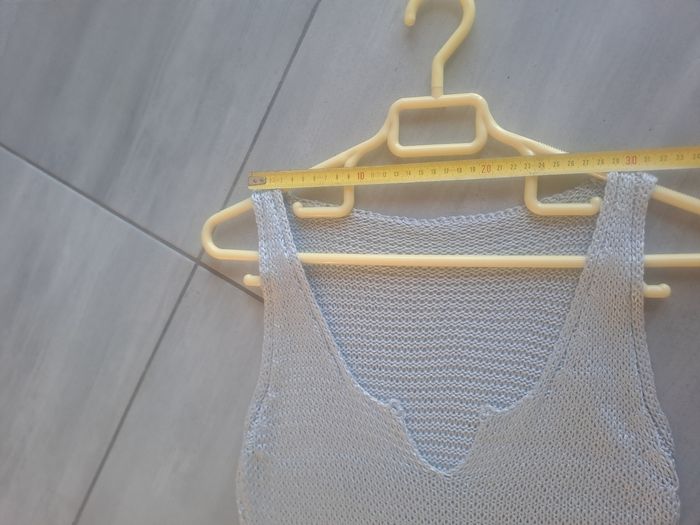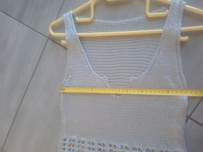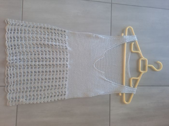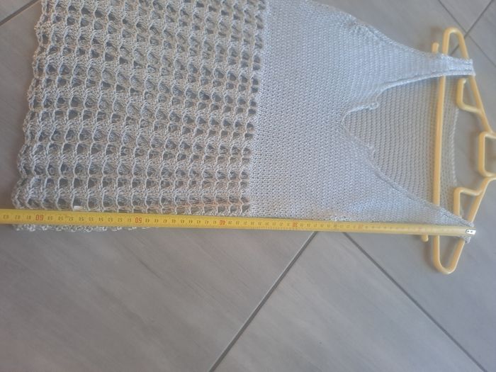Haut / Débardeur long En maille ajouré Sans manches à grosses bretelles Décolleté en V 30% Nylon / 70% Acrylique Couleur gris argenté Pas d'étiquette de taille (mesure en photos) Mesure aisselle à aisselle 34cm Pas d'étiquette de marque