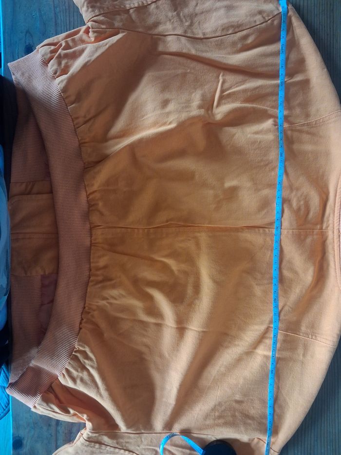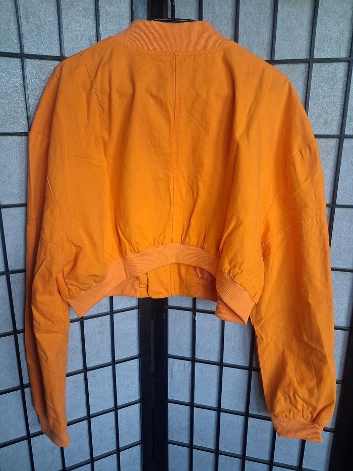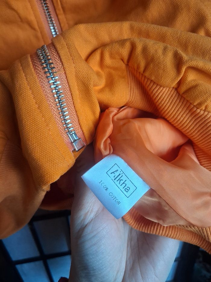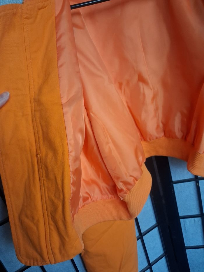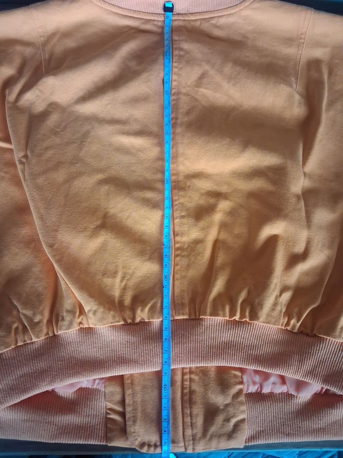 Veste femme légère et courte au niveau de la taille. Couleur orange. Extérieur façon style jeans mais interieur en tissu (voir photo). En tres bon état Taille des mensurations en photos Photo du vêtement porté impossible