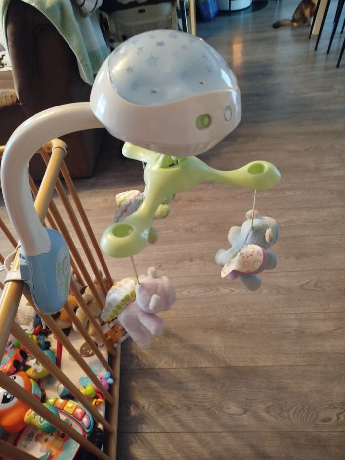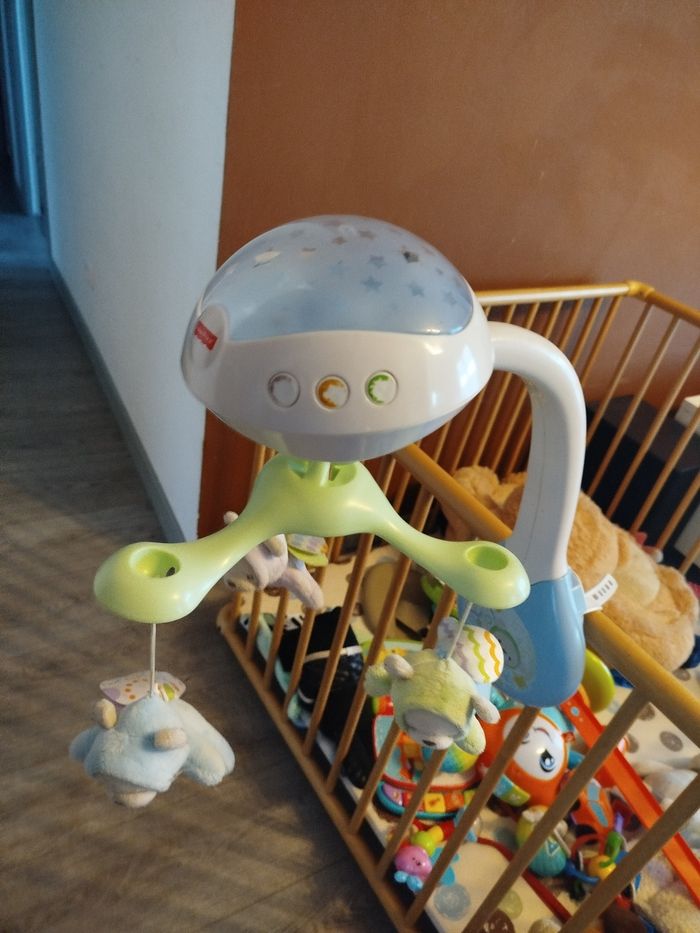 Mobile Fisher Price les boutons couleur sont un peu effacé marche super en plus je mets un mobile a accrocher de la marque Verbaudet Je n est pas la notice