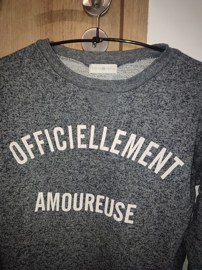 Pull Cache Cache – Taille S – Gris foncé – 3 € Je vends un pull de la marque Cache Cache, Taille : S Couleur : gris foncé Détail : slogan « Officiellement amoureuse » Prix : 3 € Idéal pour un look décontracté.